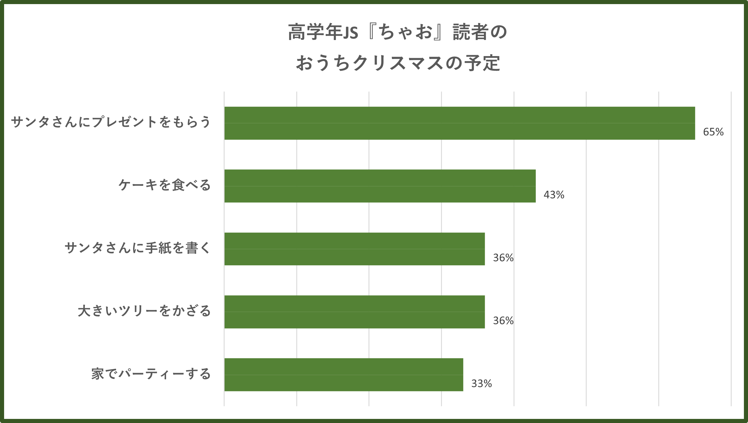 「クリスマスはおうちで何をする予定ですか?」(複数選択可能)という質問に対して、『ぷっちぐみ』読者、『ちゃお』読者ともに6割以上が「サンタさんにプレゼントをもらう」、4割以上が「ケーキを食べる」と回答しています。その他の選択肢のなかでツリーやリースなどでおうちの中を“かざる”という子も多数にのぼっており、おうちクリスマスを主体的に楽しみたいという気持ちを感じとることができます。また、『ちゃお』読者からの具体的な回答の中には、「プレゼント交換」や「キャンドルの灯で食事をする」なども挙げられており、様々な工夫をしながらおうちでのクリスマスを過ごすようです。