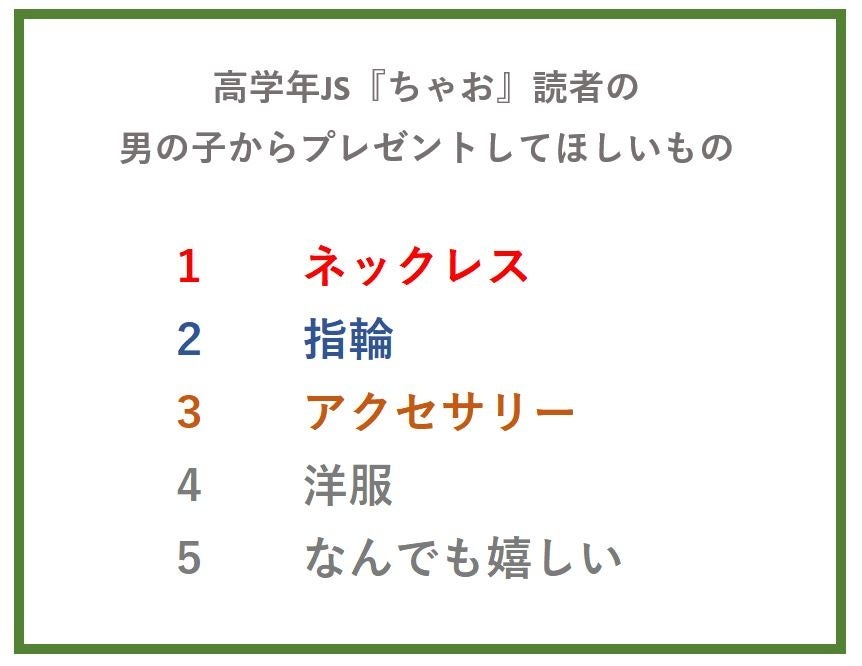 また、男の子からのプレゼントに関する質問では、「ネックレス」や「指輪」などアクセサリーに人気が集まる一方で、「気持ちだけで充分」という回答も。