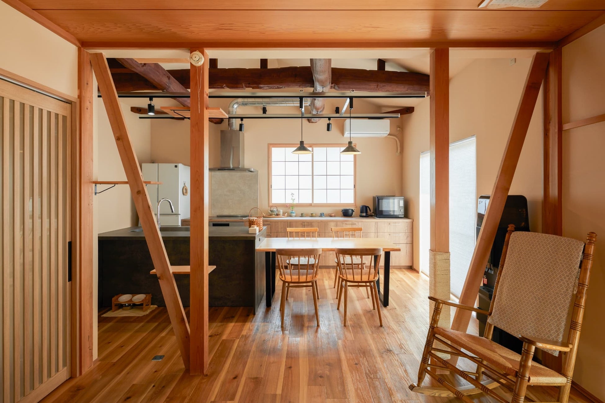 既存の丸太梁は状態も良かったことから現しにすることに。開放感なダイニングキッチンに仕上げました。梁は猫たちのキャットウォークとしても活躍しています。
