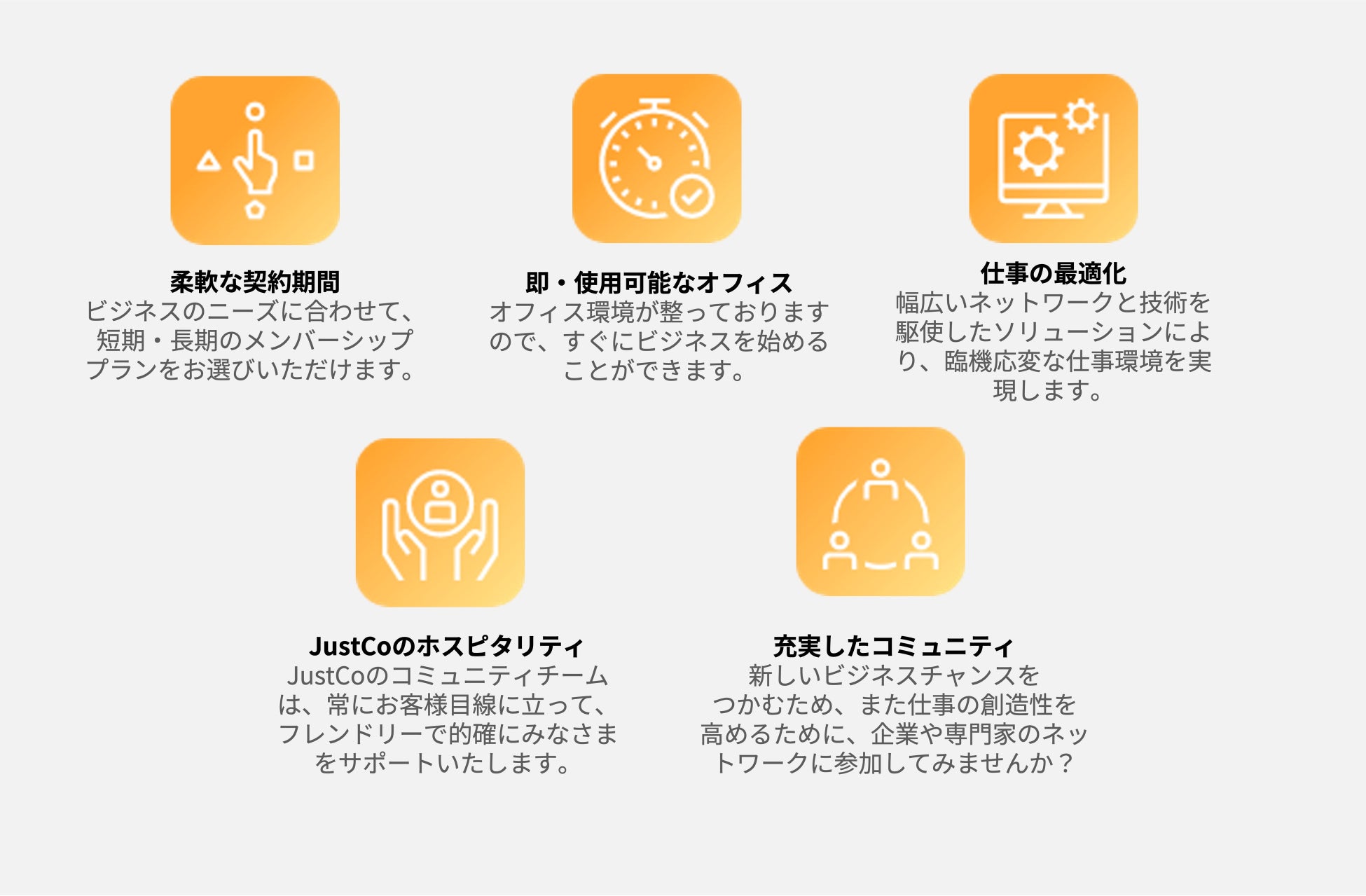 お客様のニーズに合わせて柔軟なご契約期間の設定が可能です。また、デスクや家具を揃える必要もなく、ご契約後すぐにご利用いただけます。受付や日々のオフィスサポートは、常駐しているJustCoのコミュニティチームがフレンドリー且つ的確に対応いたします。