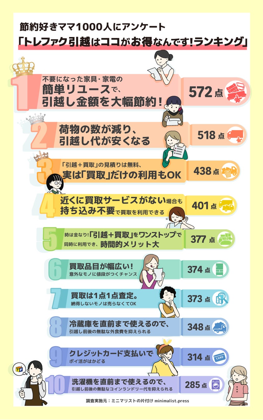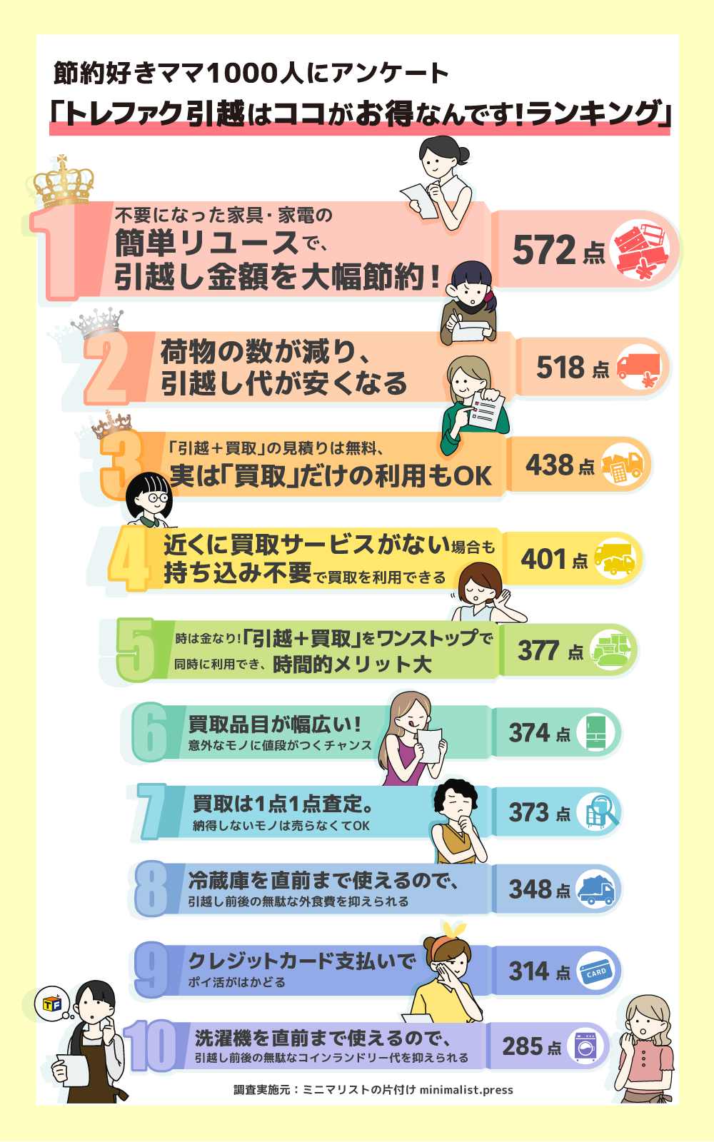 本調査では「トレファク引越でお得で便利だと思うところは?」と質問し、10の選択項目の中から4つの項目を選出いただいた。1項目1点とカウントし、その合計点でランキングを作成。