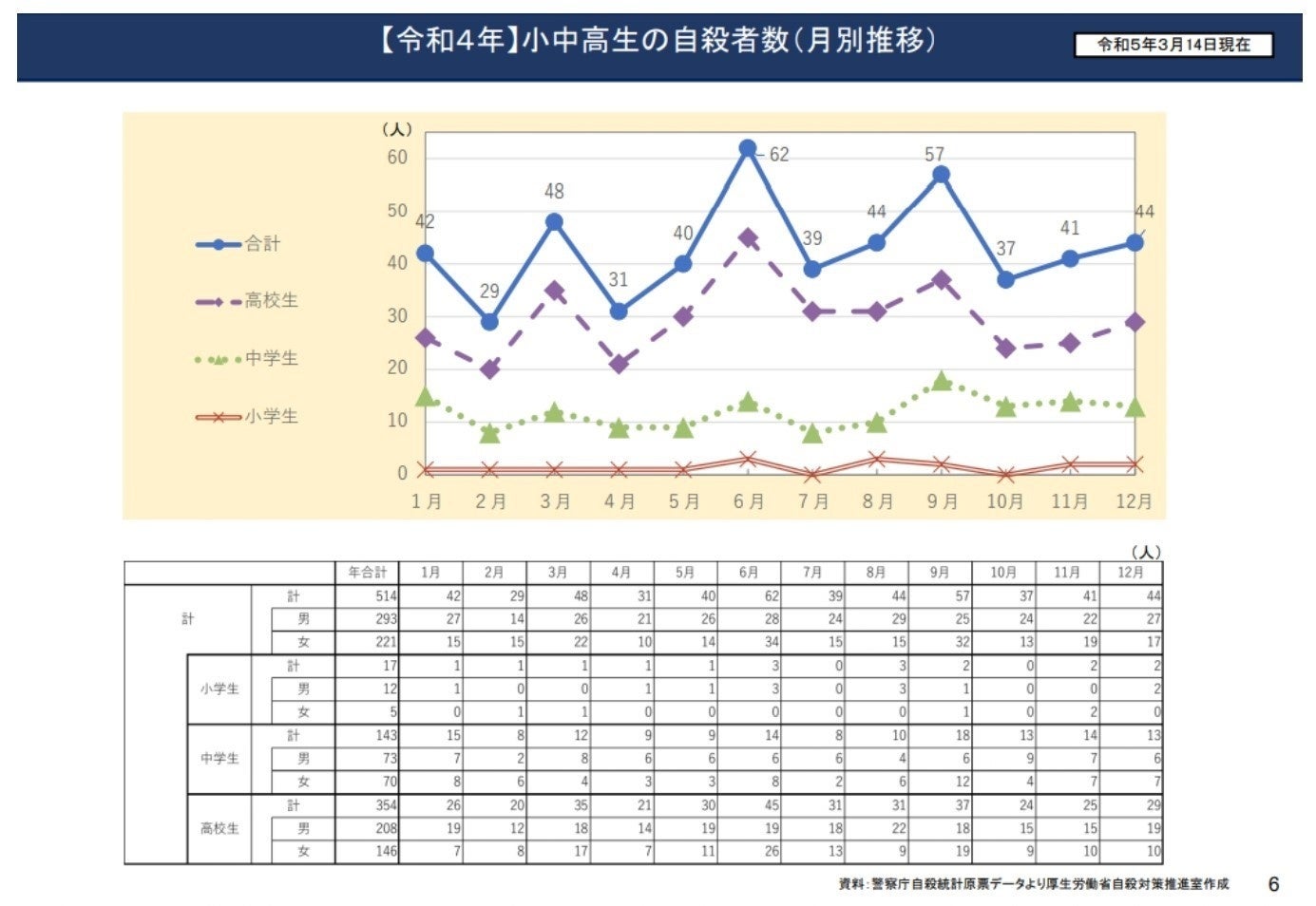 そして長らく、子どもの自殺が1年で一番多い日は9月1日と言われてきました。近年それは変化しており、2022年は6月が最多の62人でした。しかし9月も変わらず多く2番目の57人となっています。