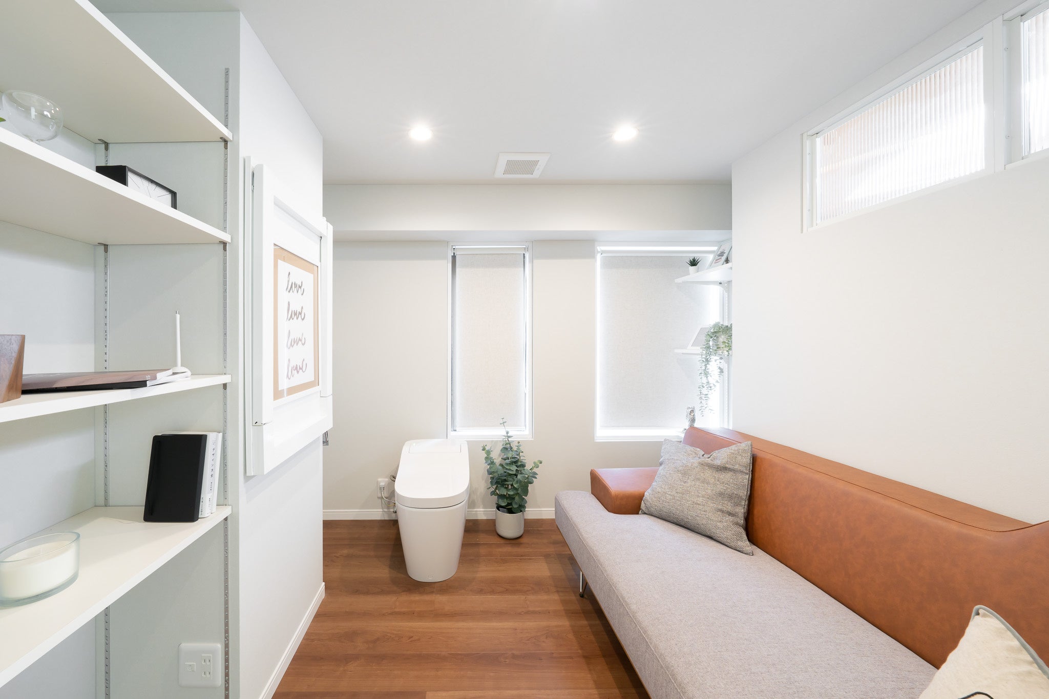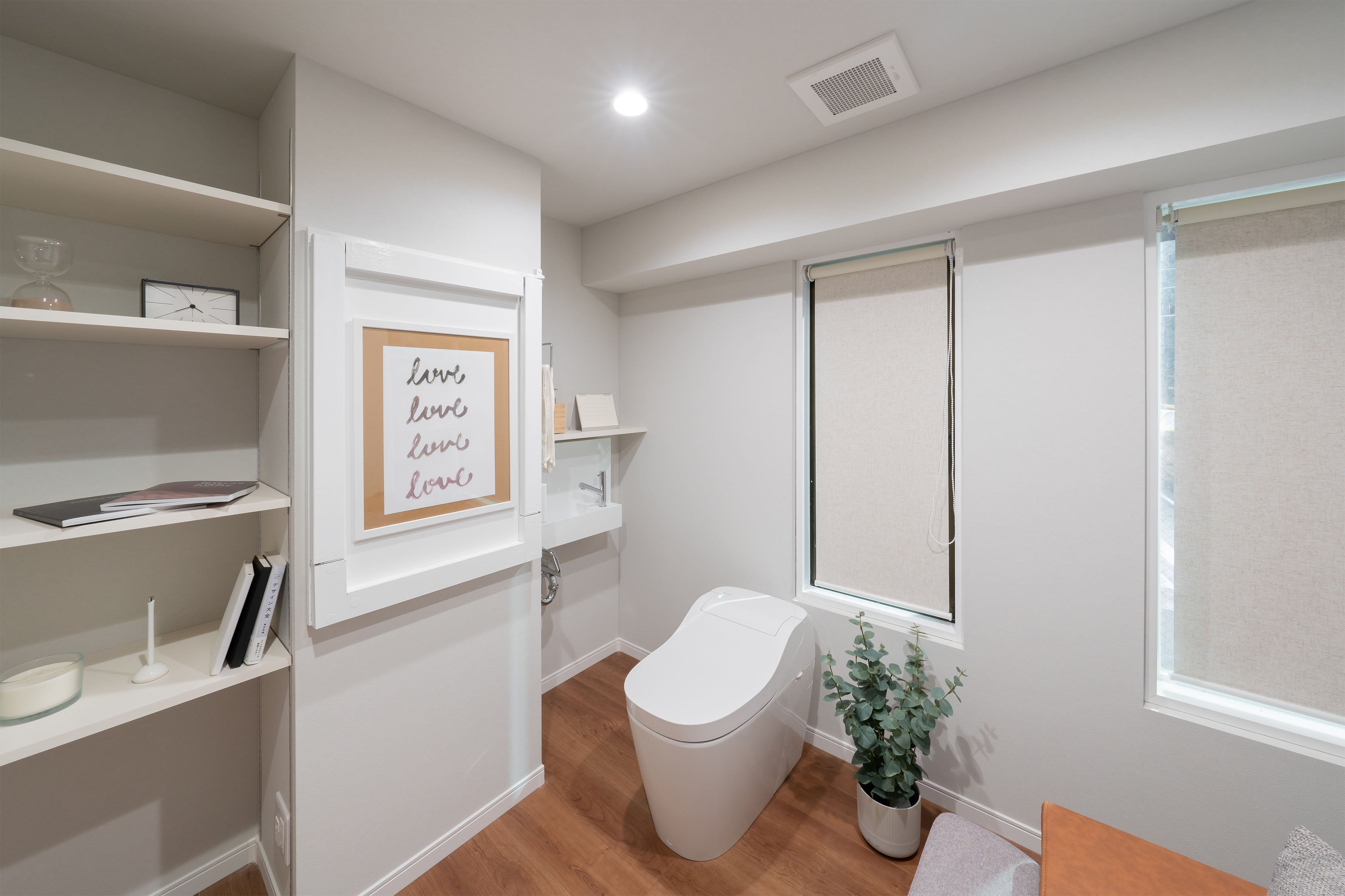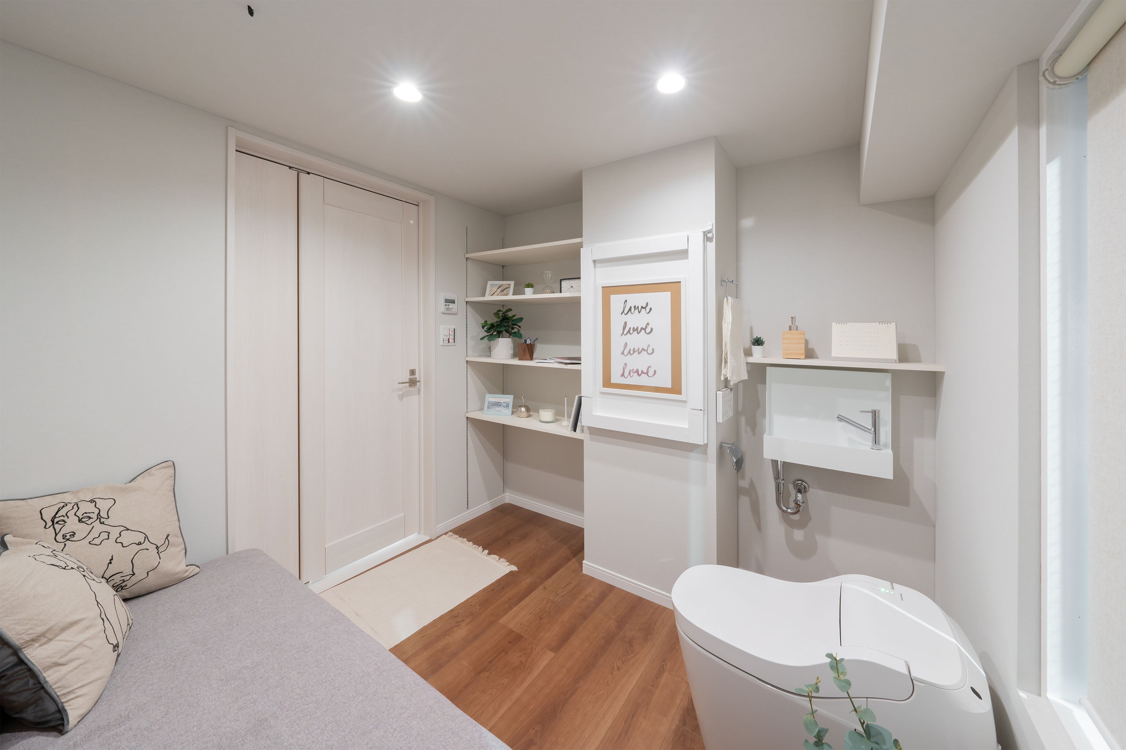 空間を最大限に活用するためタンクレストイレを採用しています。換気に関しては、広いスペースでも短時間で空気を循環させることができる単機換気扇を使用し、においを気にすることなく過ごせる空間に。ダウンライトスピーカーは、 Bluetoothによってスマートフォンやオーディオ機器との接続が可能。好きな音楽を聴きながら、リビングのようにリラックスできます。また、ワークスペースとして機能するために、トイレに座りながら作業ができるパソコンデスクを完備。その他、人口肛門や人口膀胱の方にとって必要不可欠なオストメイトの設置や、手すりなどのバリアフリー設備の設置も個人に合わせてカスタマイズできる仕様となっています。