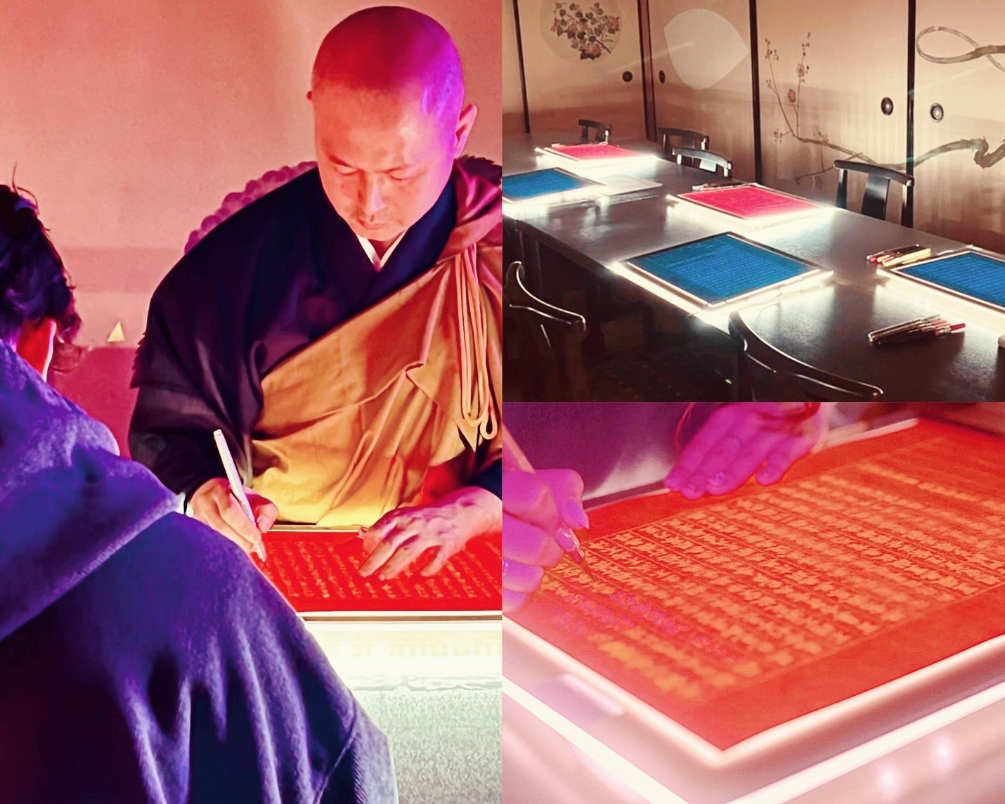 ※いま宗三寺でしか体験できない、暗闇の中での「ネオン写経」です