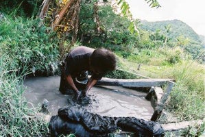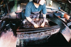 鹿児島県の南方に位置する奄美大島でのみ作られる「大島紬(おおしまつむぎ)」を染色する際に使うのが、1,300年以上もの歴史を持つ「泥染(どろぞめ)」です。奄美大島に自生している「テーチ木」の染料で染色をした後、目の細かい泥に浸すことで、布や皮革は特有の色合いに染まっていきます。特にレザーの染色は非常に難しく、手法の確立までに10年以上もの歳月を費やしました。化学染料では再現できない深い色合いが、様々な世代からの人気を集めています。