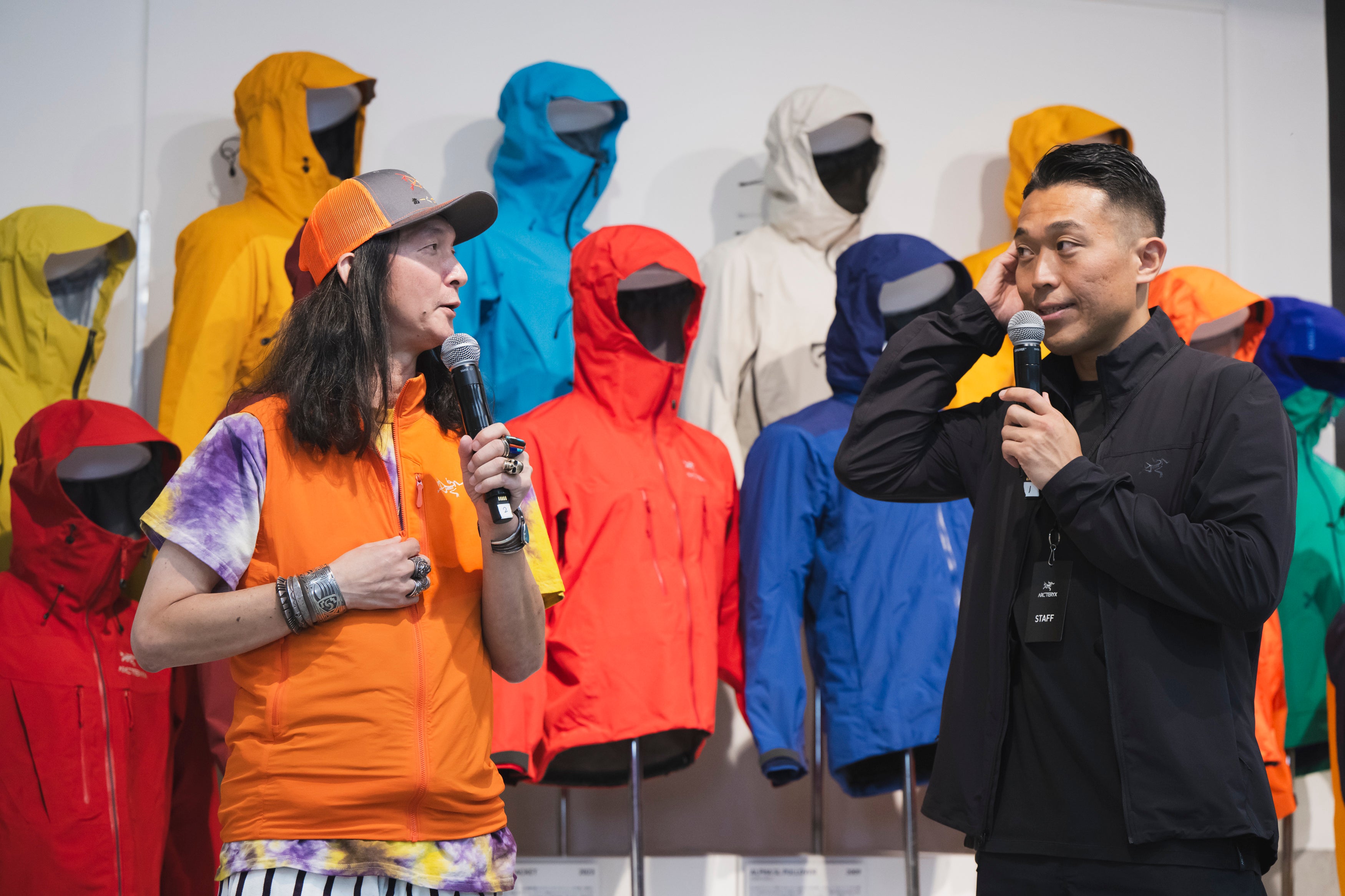 まず最初に廣沢氏より、アークテリクスを知ったきっかけについて伺いました。「アメリカに買い付けに行ったとき、お世話になっていたSAWS COMPANYの方に教えていただいたことが始まりでした。初めてアークテリクスのプロダクトを見たときは、絶妙なカラーリングと非常に丁寧な縫製に衝撃を覚え、そこからファンになりました。」と印象的な出会いを語ってくれました。また、先輩が間違って買ったものを譲ってもらったのがきっかけとなり、一番最初に手に入れたプロダクトは「ミウラ」。そんな廣沢さんが、今回並んでいるプロダクトの中で、最も思い出深くイチオシのものに選んだのは、シータ AR ジャケットでした。「初めてゲットしたジャケットで、むき出しの3本のジッパーが印象的であることや、ワントーンに見えるが、実はツートーンになっていることが特徴で、アークテリクスの技術が詰まったプロダクトです。」とお話いただきました。また、プロダクトが非常にきれいな状態で保存されているように見えるが、どのようにケアをしているのか、という質問に廣沢氏は「基本的に家の洗濯機で洗濯し、その中でも特に皮脂が目立つ首元は重点的に洗います」と回答し、製品のお手入れへのこだわりも語ってくれました。