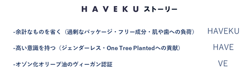 HAVEKU(ハヴク)は、余計なものを省く(HAVEKU)、高い意識をもつ(HAVE)、当社のオリジナル原料、オゾン化オリーブ油のヴィーガン認証(VE)のこだわりなどの想いから名付けました。HAVEKUは、通常の化粧品にみられる過剰なパッケージ装飾、フリー成分※、肌や歯への負荷などの余計なものを省き、お肌や歯に必要なものを豊かに取り入れました。また、これからの社会を意識し、ジェンダーレスな商品設計や、売り上げの一部を寄付し、世界中に植樹を行う「One Tree Planted活動」への参加に取り組んでいます。余計なものを省き、“地球と人へのやさしさ”をとことん追求した商品をHAVEKUはお届けします。