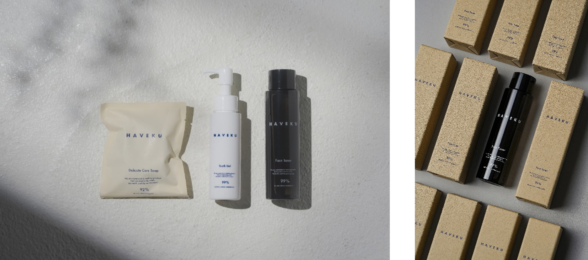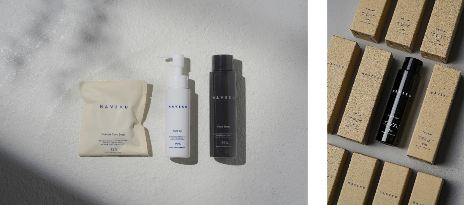 HAVEKU(ハヴク)は、これからの時代に不要な、過剰なパッケージ包装などの環境負荷やフリー成分、肌や歯への負担などを省き、オーガニックの本質に真摯に向き合いました。性別を問わず、誰もが使いやすいジェンダーレスコスメブランドです。国際標準ISO16128に基づく「自然由来指数」にこだわり、必要なものは豊かに、自然由来指数92%を超える、トゥースジェル・デリケートケアソープ・フェイストナーの3種類を展開します。