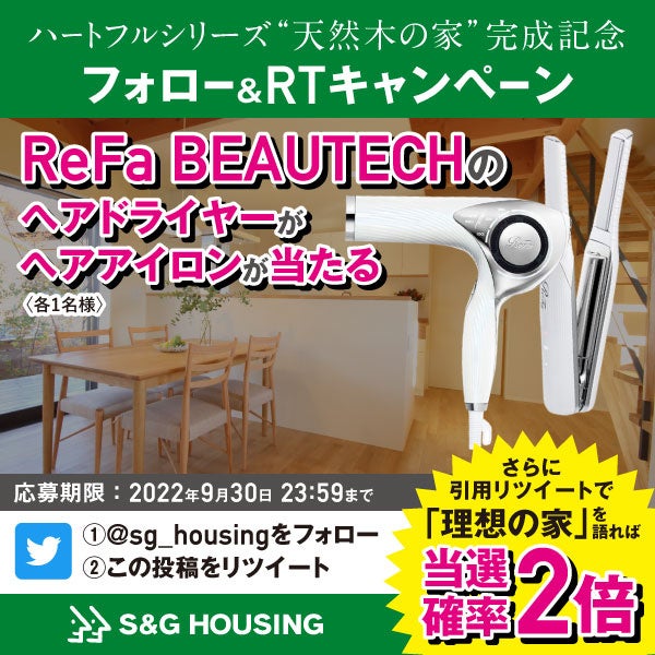 ハートフルシリーズ「岩倉南三宅町」のオープンハウス完成を記念して、Twitterキャンペーンを実施します。応募方法は、S&Gハウジング公式Twitterをフォローして該当のキャンペーンツイートをリツイートするだけ。引用リツイートで「理想の家」について語れば、当選確率が2倍になります。