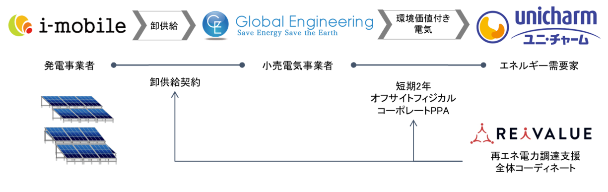 今回、ユニ・チャームの再生可能エネルギー電力調達を支援するリアイバリューは、グローバルエンジニアリングと共に短期オフサイトフィジカルコーポレートPPAのスキームを構築、アイモバイルが推進する遊休地や耕作放棄地を活用した新設営農型太陽光発電所を電源に採用することで、追加性(注2)のある再エネをユニ・チャームへ届けることを実現しました。