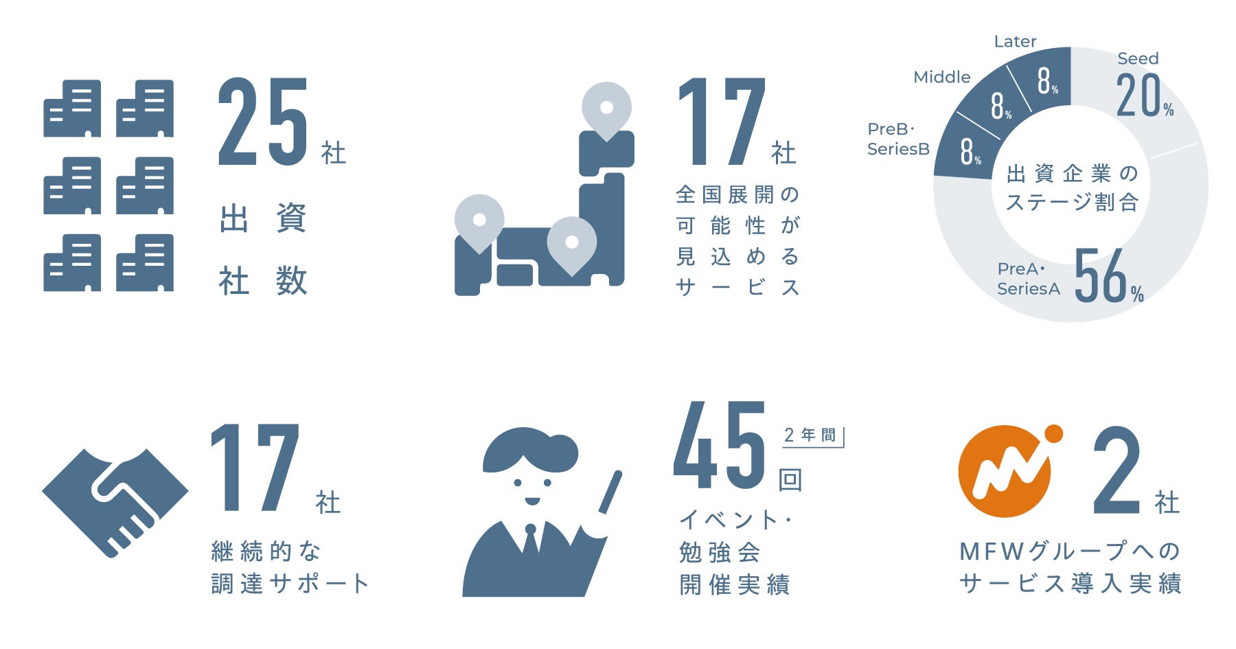 1号ファンドではシード・アーリーステージを中心のスタートアップ計25社に出資しました。HIRAC FUNDはファンドの強みである起業家、経営者のコミュニティを用いた支援や金融機関とのネットワークによるビジネス機会の創出、マネーフォワードグループの知見を活用して、引き続き投資先の成長をサポートしてまいります。