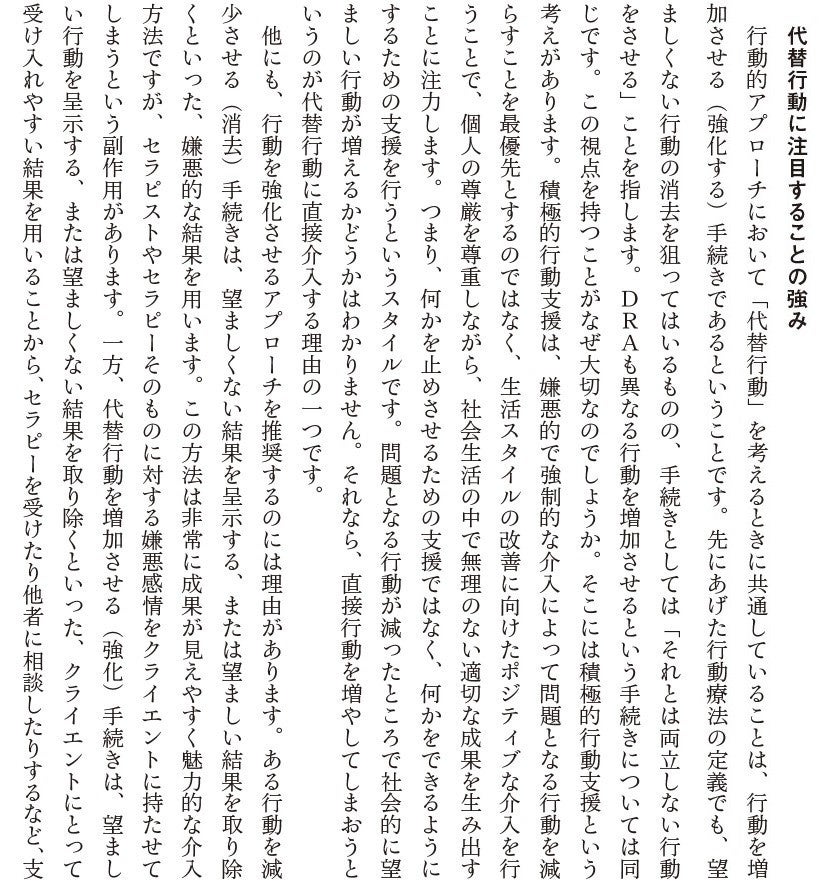 本書のテーマである代替行動のアプローチは,「やめたいのにやめられない」行動の代わりとなる望ましい行動を増やす,クライエントの方にとって受け入れやすいポジティブな支援であると述べられています(p.ⅳ,ⅴ:少し長い「はじめに」より)。