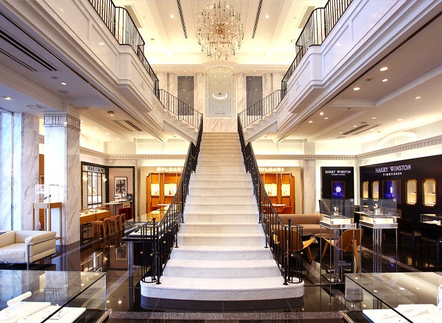 1階・2階の広々としたウォッチサロンには、新しく取扱いを始めたピアジェ、ユリス・ナルダン、モーリス・ラクロアや、最近時計業界で話題の的となっている希少ブランド「パルミジャーニ・フルリエ」、そして、オメガ、IWC、グラスヒュッテ・オリジナルなどの一流時計メーカー、また、カルテイエ、ブルガリ、ハリー・ウィンストン、シャネルなどのラグジュアリーブランドの時計を多数取り揃え、普段とはひと味違ったおもてなしや特典とともに、皆様のご来館をお待ちしています。