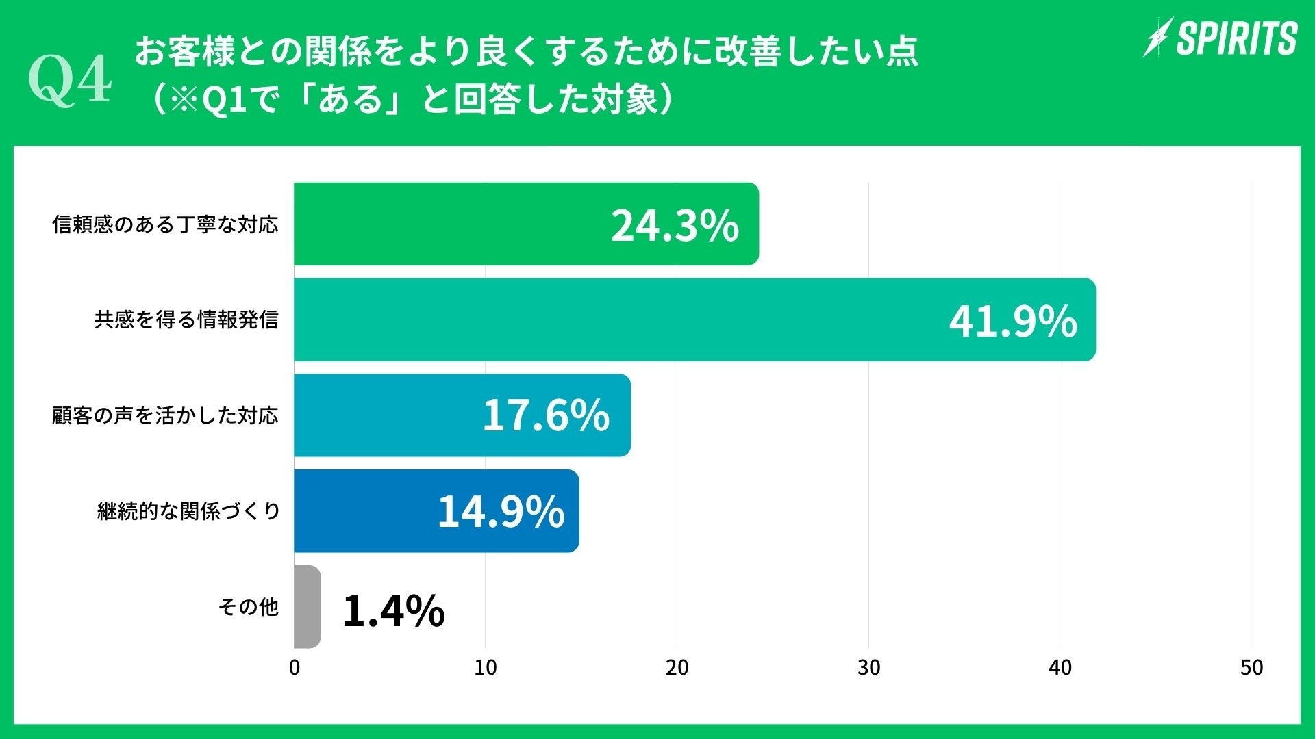 改善したい点として最も多く挙げられたのは「共感を得る情報発信」(41.9%)です。これは、顧客の心に響くコンテンツの策定が難しい、または担当者が十分な時間やリソースを確保できず、内容が薄くなりがちである可能性を示唆しています。さらに、「信頼感のある丁寧な対応」や「顧客の声を活かした対応」も一定の支持を得ており、各企業が多角的なアプローチで顧客との関係強化を模索している状況が伺えます。
