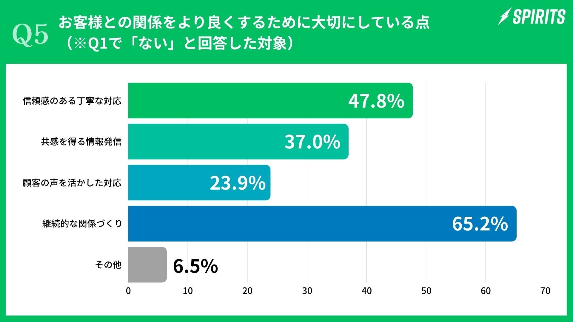 公式LINEを効果的に活用している企業は、既に安定した顧客関係を築いていると評価されます。実際、65.2%の回答者が「継続的な関係づくり」を最も重視しており、これが長期的な顧客ロイヤルティの基盤となっています。一方、Q4の回答と比べると、公式LINEをビジネス活用する際の優先順位には明確なギャップが見られ、今後の運用改善では「継続的な関係づくり」の実践が鍵となるでしょう。