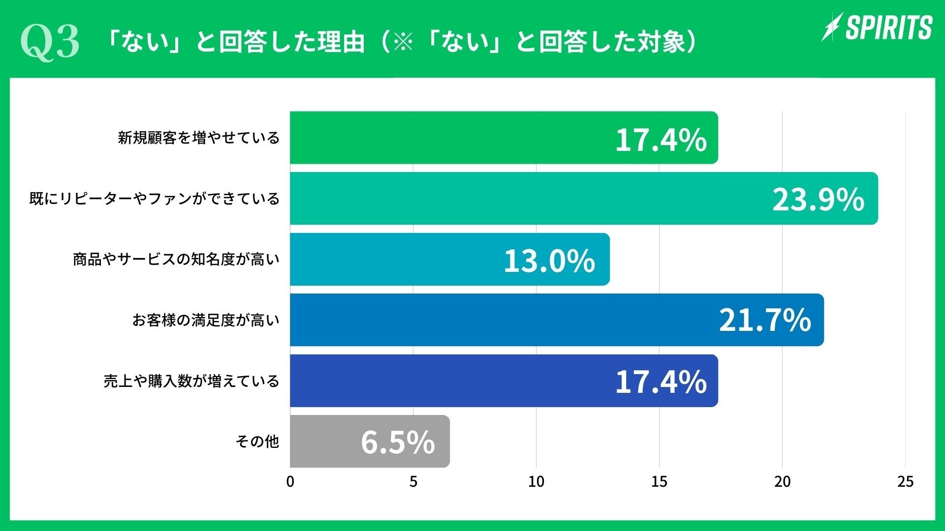 課題や不安がない回答者は、既存の顧客との関係が安定しており、リピーターやファンの獲得、さらにはお客様の高い満足度が成功要因として機能していると評価しています。これらの成功事例は、公式LINEの運用で課題や不安を感じている企業にとって、効果的な改善策を模索する上で参考になるでしょう。