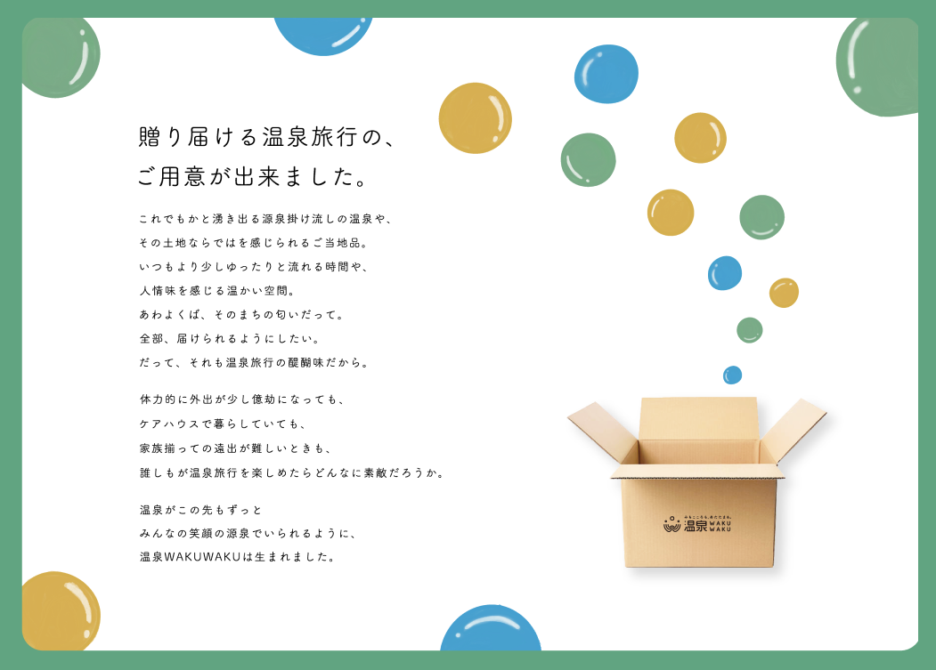 温泉WAKUWAKUとは温泉地から湧き出る源泉を直接汲み取り、全国各地の100%源泉掛け流しの温泉をお届けする温泉旅行体験のギフトサービスです。源泉をメインとした「源泉掛け流し温泉セット」と、源泉と共に現地の特産品などを一緒にお届けする「温泉旅行体験セット」をご用意しております。ご自宅で沸かしたお風呂に温泉の源泉を注ぐだけで本格的な温泉を感じていただけますが、町を紹介するパンフレットや現地の特産品などとセットで楽しんでいただくことで、ご自宅内であってもその土地を感じてもらう体験を促していきたいと考えております。現在は、横須賀の久里浜にある海辺の湯久里浜温泉と静岡市葵区の梅ヶ島温泉郷にある梅ヶ島コンヤ温泉の2ヶ所の温泉パートナー様と連携しており、今後、日本各地の温泉パートナー様との連携を増やしてまいります。また、温泉WAKUWAKUを通じて、その温泉地を知り、そして関心を持っていただくことで、現地に訪問するお客様が増えるような循環を作ることも目指しています。日本が誇る経営資源でもある温泉を持つ地域の活性化にも貢献してまいります。