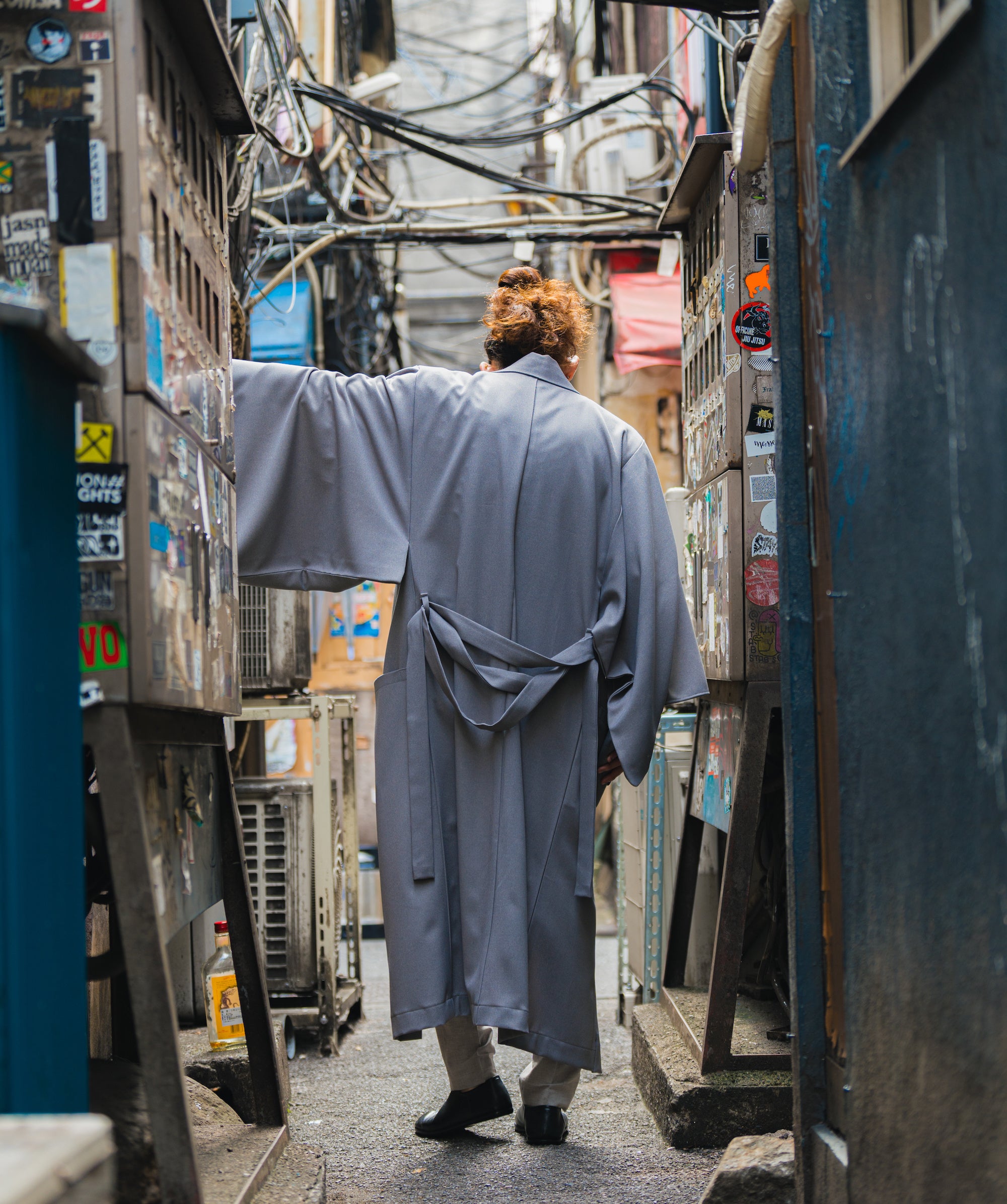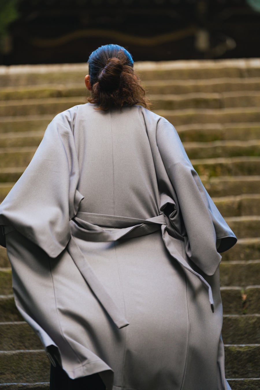 着物の直線的なデザインを残し、大きな袖を残すことで、和の雰囲気を残しつつ