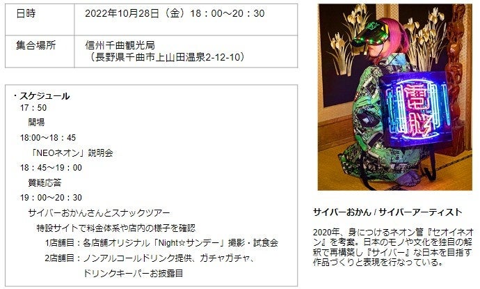 「NEOネオン」は一般社団法人信州千曲観光局による、スナックの魅力を再定義するプロジェクトです。10月28日(金)の「NEOネオン説明・体験会」では本プロジェクトの概要説明に加え、プロジェクトの象徴であるネオンを背負った(セオイネオン)サイバーおかんさんが、「NEOネオン」協力店舗である約15店舗以上のスナックがある温泉街を練り歩き、体験会を先導します。