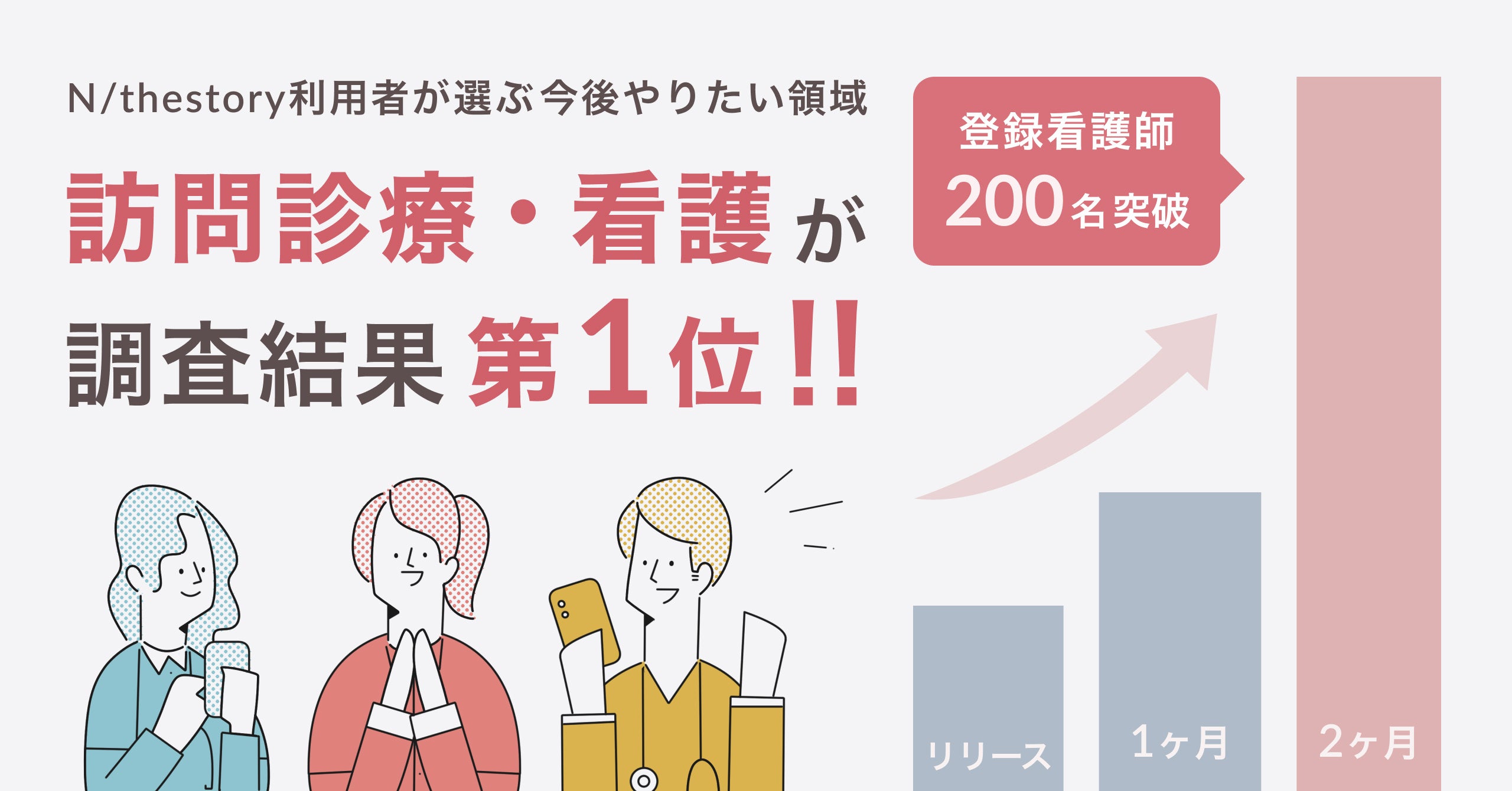 株式会社thestory(ジストリー)(本社:福岡県糸島市、代表:河京子 / 山本遼太郎)が運営する看護師の「やりたい、学びたい」を応援するスカウト型採用・転職マッチングアプリ「N/thestory(ジストリー)」(iOS,Android)は、リリースから2か月で登録看護師数が200名を突破したことをお知らせいたします。登録者から最も選ばれている「やりたい、学びたい診療領域」は、患者・利用者とじっくり関わる看護ができる「訪問診療/看護領域」となりました。また、登録者のボリュームゾーンは経験年数3~5年目が34%、25~35歳が60%となり、「やりたい、学びたい」看護を希望する若手看護師に多数利用いただいています。