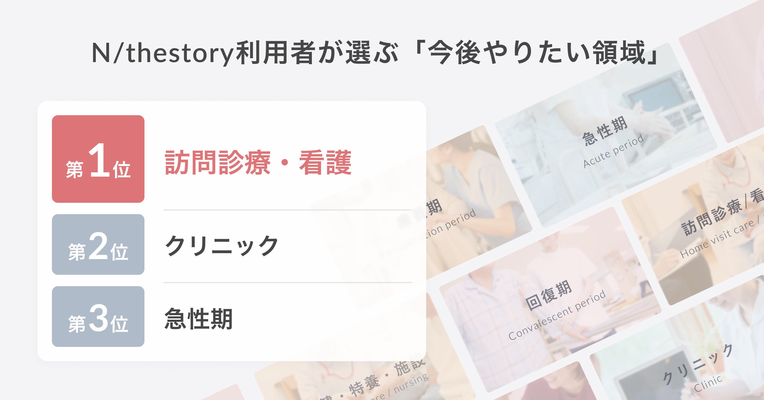 一方で、「訪問看護の仕事に就いた理由(※2)」調査からは、全年代の49.2%が「働きがいのある仕事だから」を選択しており、さらに20~29歳の回答では「自分の理想の看護をやりたかったから」が47.8%と約半数を占める結果となっていることから、やりたいことや学びたいことがある意欲の高い看護師が「訪問診療/看護領域」を希望する傾向があることが読み取れます。「やりたい、学びたい」を軸にした転職アプリである「N/thestory」の登録者データにおいても、レジュメ登録時に選ぶ「やりたい、学びたい診療科」の第1位が「訪問診療/看護領域」となっております。