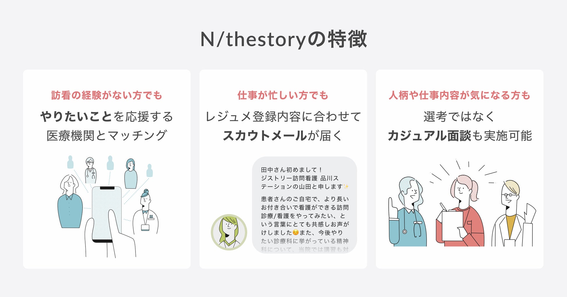 - 訪問診療/看護領域への転職を応援する「N/thestory」マッチング機能の特徴