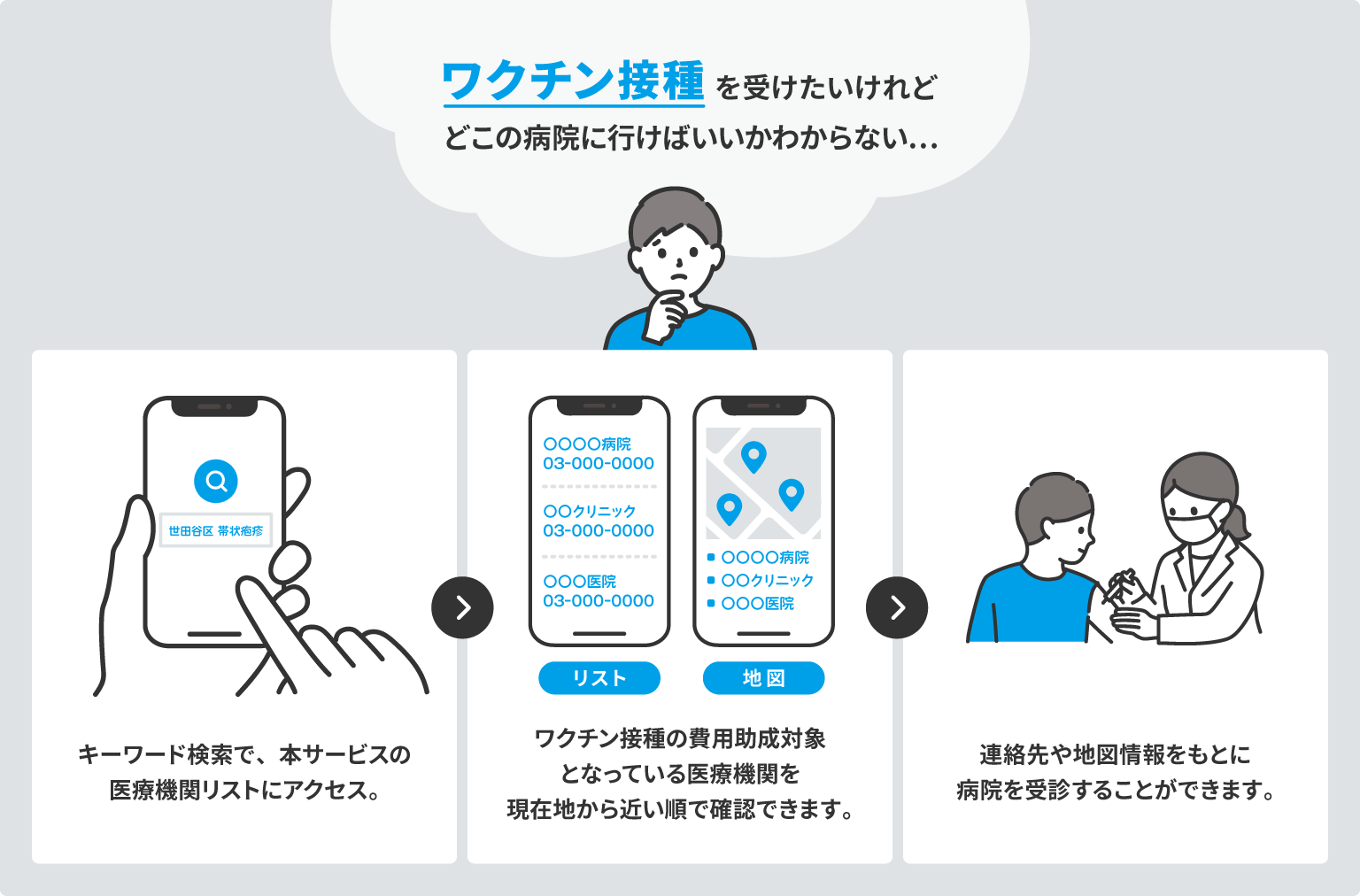 昨年、東京都の発熱外来を実施している医療機関の一覧をまとめたサービスをリリースしたところ多くの方に使っていただくことができました。弊社としても想定以上の反響をいただきとてもありがたく、発熱外来の他にも困っている方の手助けをすることができないかと考え、今回の帯状疱疹ワクチン助成を受けることができる医療機関の一覧サービスのプロジェクトが始まりました。