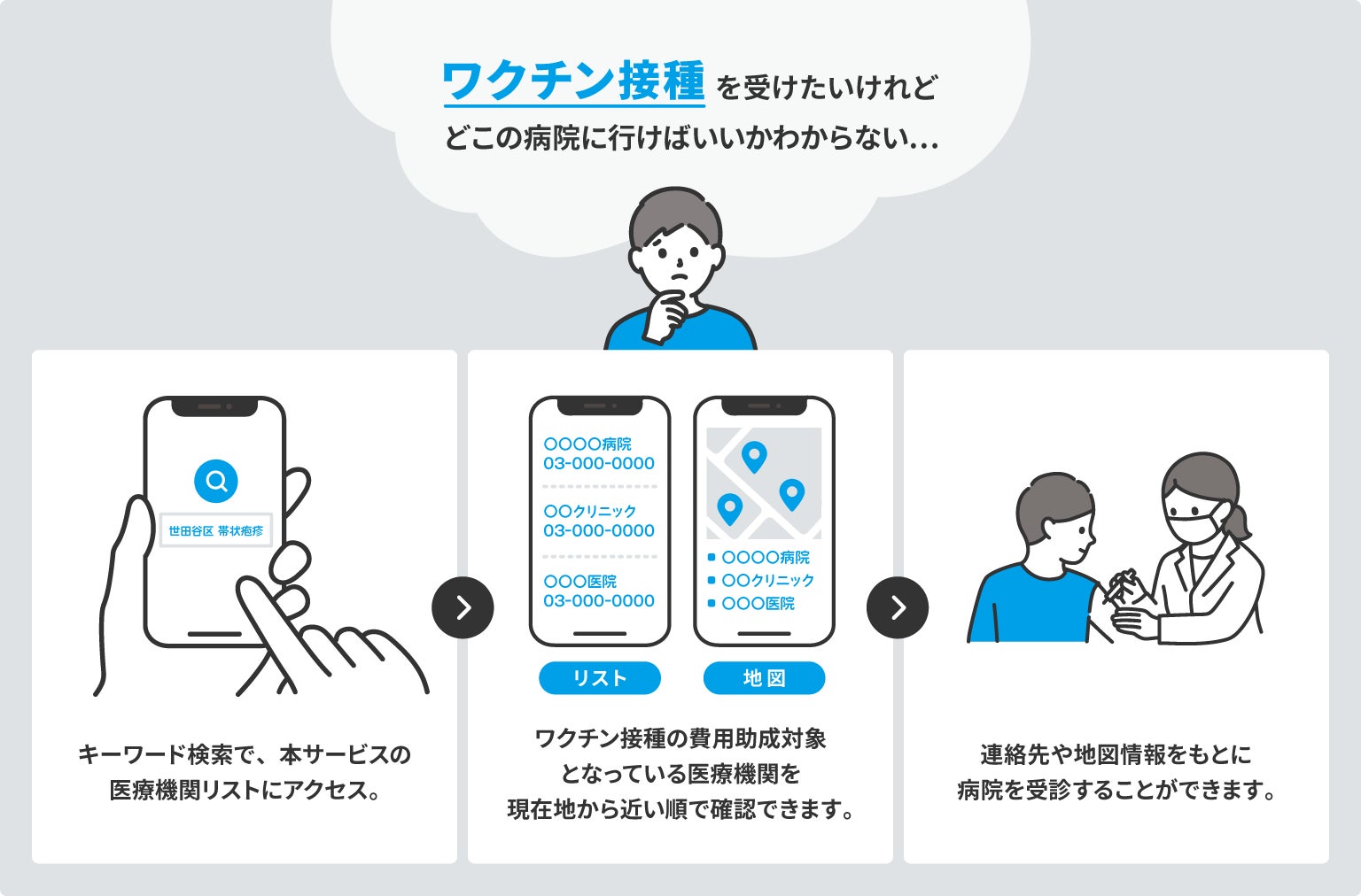 第一弾として、東京都の帯状疱疹ワクチン任意接種において一部費用助成が受けられる医療機関一覧の提供を開始し、順次、対象エリアや対象疾患を広げていく予定です。