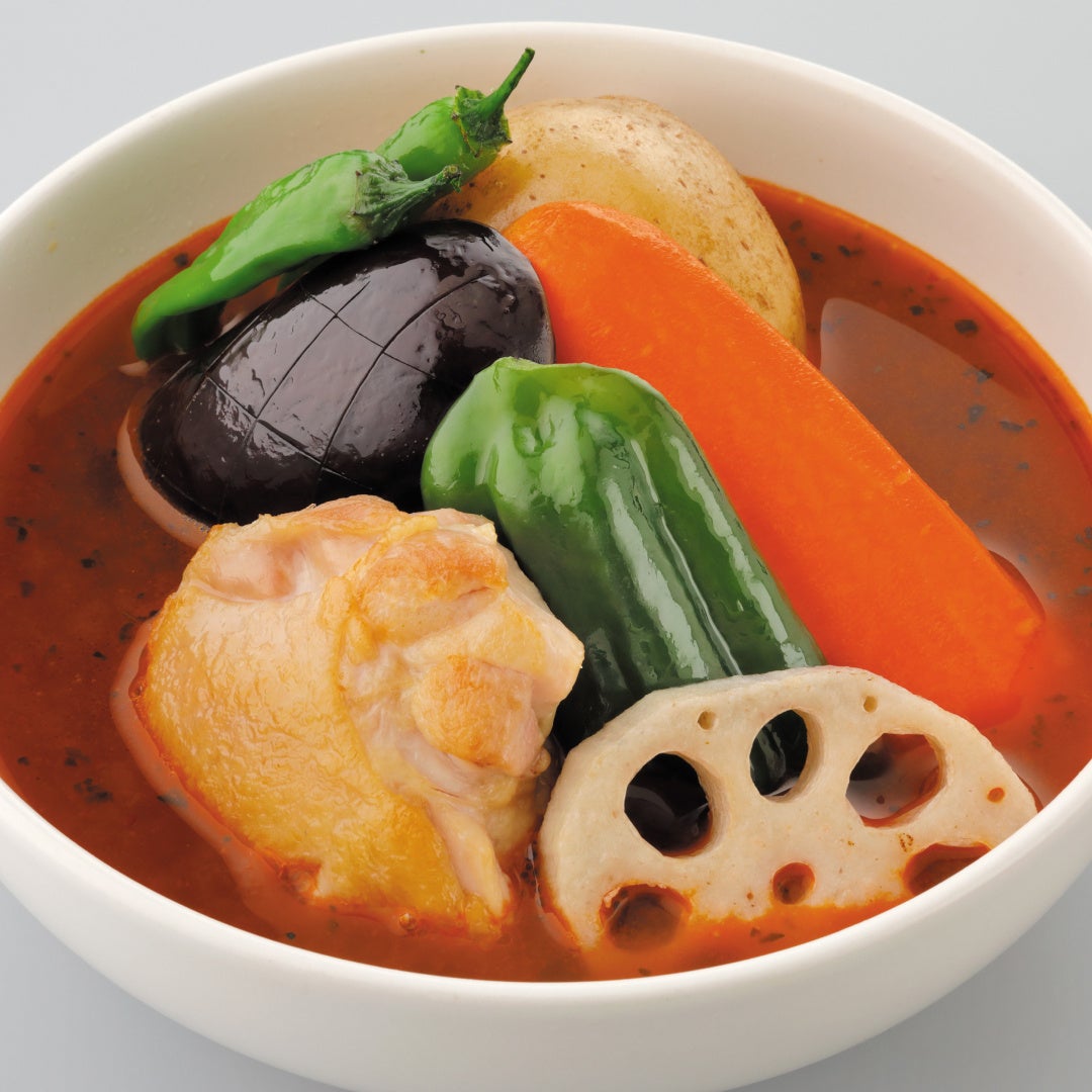 じっくり炒めた野菜とチキンの旨みに、スパイスのコクが効いた辛口のスープカレーの素で、お馴染みの瓶に辛さを強調した赤と黒のラベルが目印です。