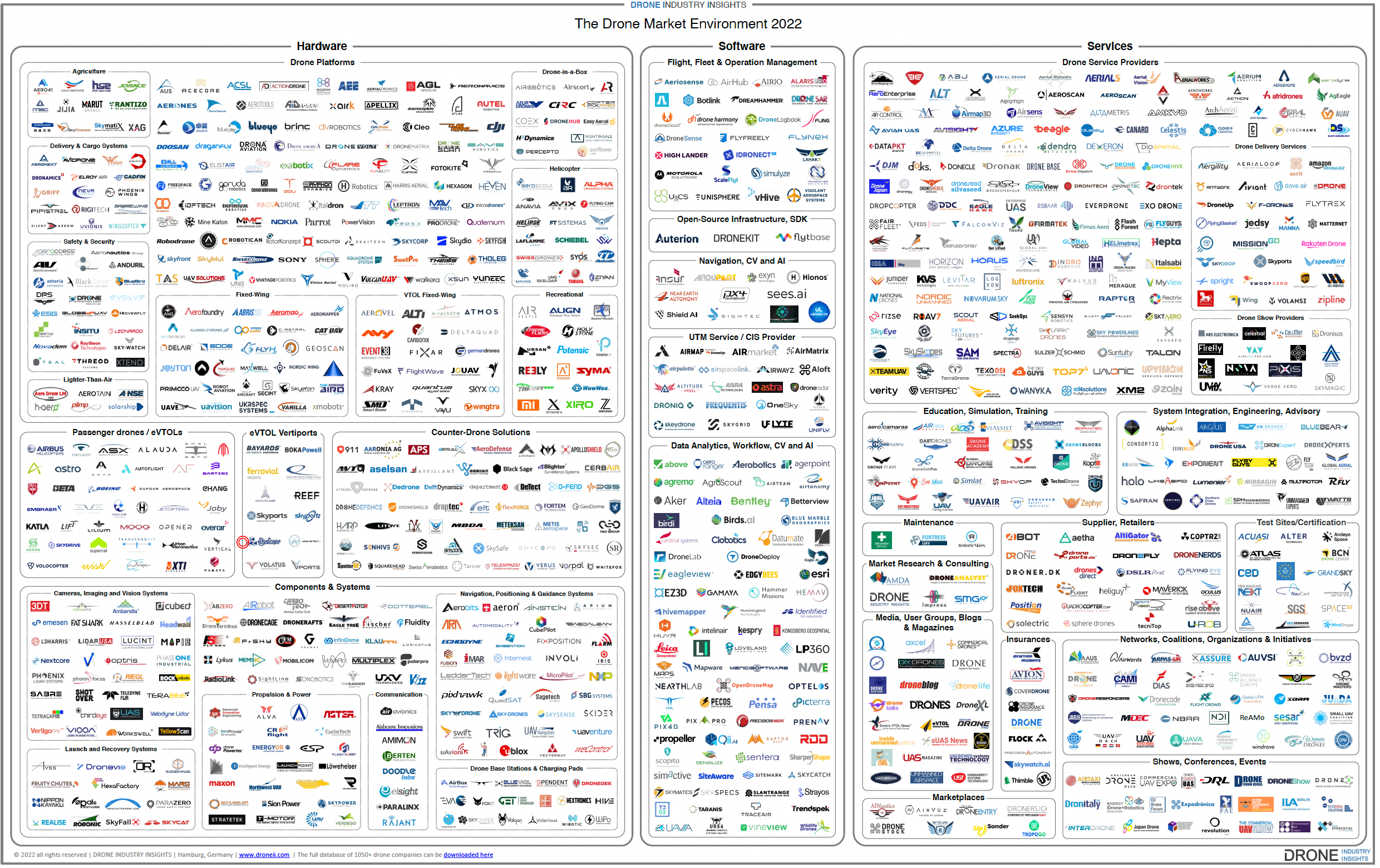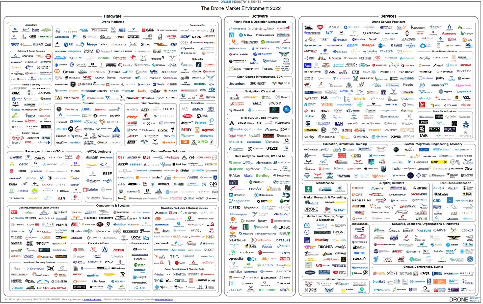 Drone Industrial Insightsが毎年発表するこのマップは、このアドバンスドエアモビリティ産業の様々な分野で活躍する企業を掲載しており、その多様性が伺えます。