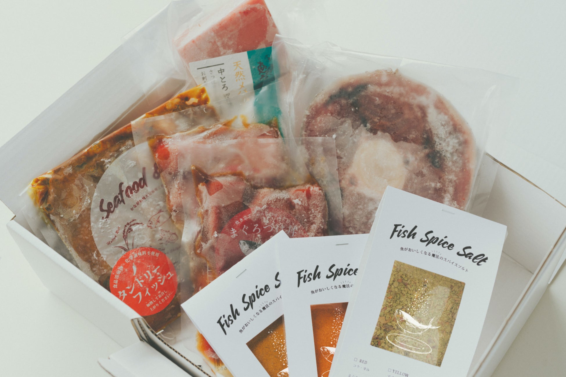 「フィッシュスパイスソルト」3種類に、「まぐろづけ丼」や「シーフード&ミソ タンドリー」、まぐろの「尾の身」などが入ったセット。フィッシュスパイスソルトとそれぞれの商品を使って、アレンジしながら楽しんでいただけます。