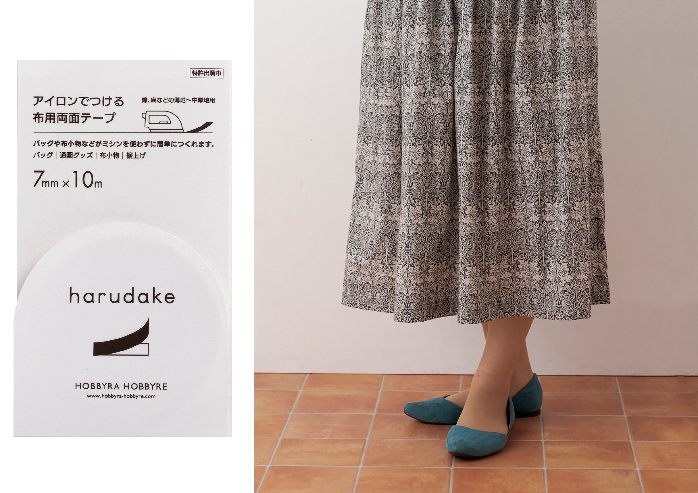 『harudake』には強力な接着力があり、ミシンや針・糸がなくてもアイロンをかけるだけで、ズボンやスカートの裾上げやバッグなどの布小物、簡単なスカートが作れます。用途に応じて7mm・10mm・15mmの3サイズを展開します。