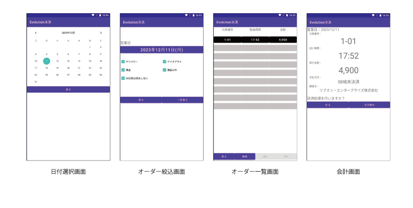 操作はシンプルで、モバイル型オールインワン決済端末内に「Evolution決済」アプリが登録されており、配達先での会計時に本アプリを起動します。