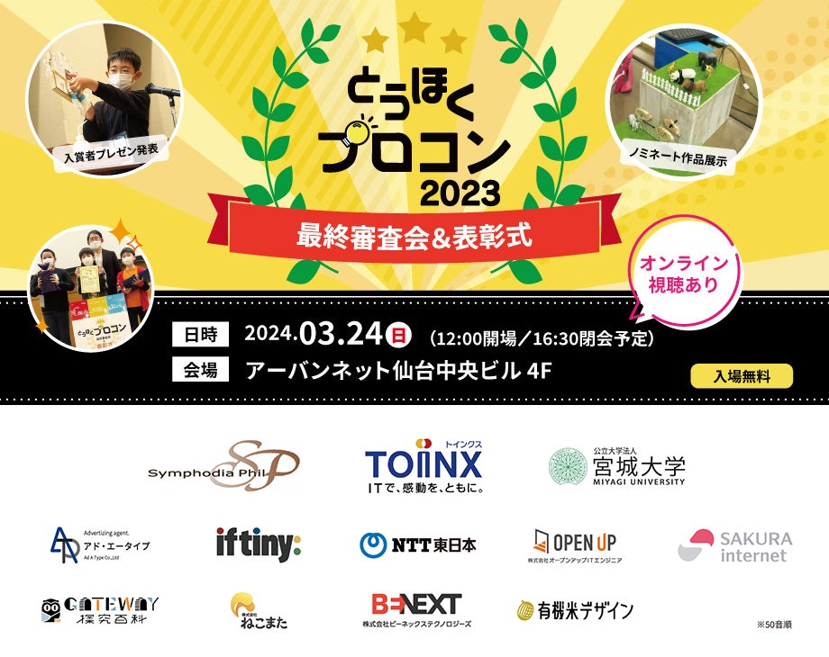 とうほくプロコン実行委員会は、東北地方在住の小中学生のためのプログラミングコンテスト「とうほくプロコン2023」の最終審査会&表彰式をアーバンネット仙台中央ビルで開催します。YouTubeライブも同時配信!