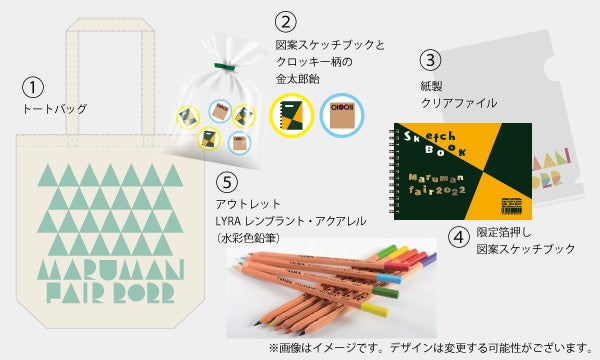 ご来場いただいた方には、もれなくマルマンフェア限定のトートバッグや、マルマンブランドの製品がモチーフとなったかわいい金太郎飴、紙製のクリアファイルなど、帰ったあとも楽しめるお土産を用意しております。