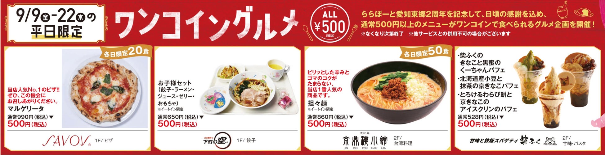 ららぽーと愛知東郷の飲食店から日頃の感謝を込めた特別価格のメニューをご賞味ください。