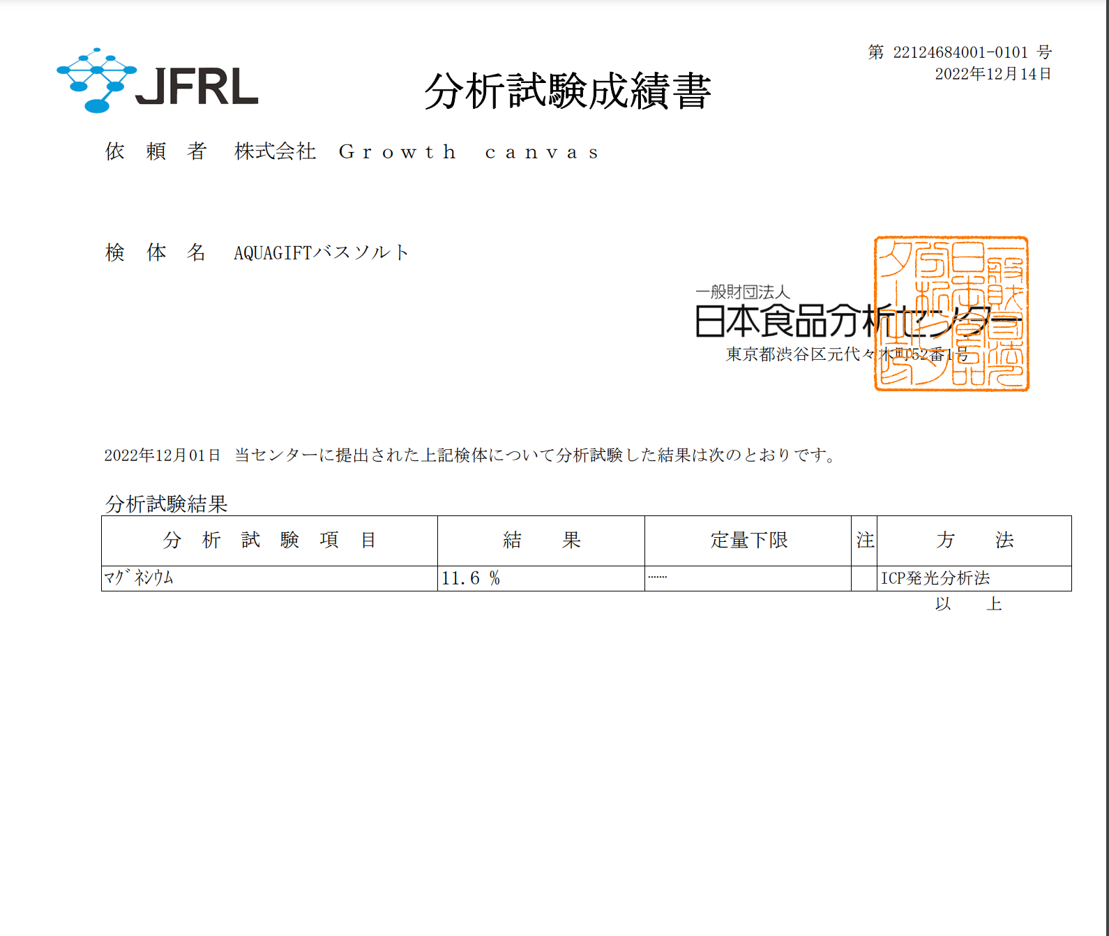 昨今、吸収率が低い成分を使用したマグネシウム系バスソルトや、塩分 ( ナトリウム )が主成分で お肌のカサカサや浴槽を傷つける原因になるバスソルトなどが販売されており、 「AQUAGIFT(アクアギフト)」バスソルトを利用される方へ、品質を疑うことなくご納得頂いた上で購入して頂きたいと思い、外部分析機関である、一般財団法人日本食品分析センター様にて検査をお願い致しました。