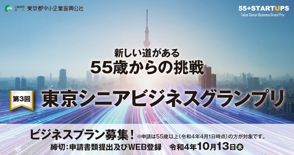 公益財団法人東京都中小企業振興公社(所在地:東京都千代田区、理事長:目黒 克昭)は、シニア層の働き方や人生設計をより豊かにするための、シニア世代の起業を後押しすることを目的に、55歳以上を対象としたビジネスプランコンテスト「第3回 東京シニアビジネスグランプリ」を開催いたします。