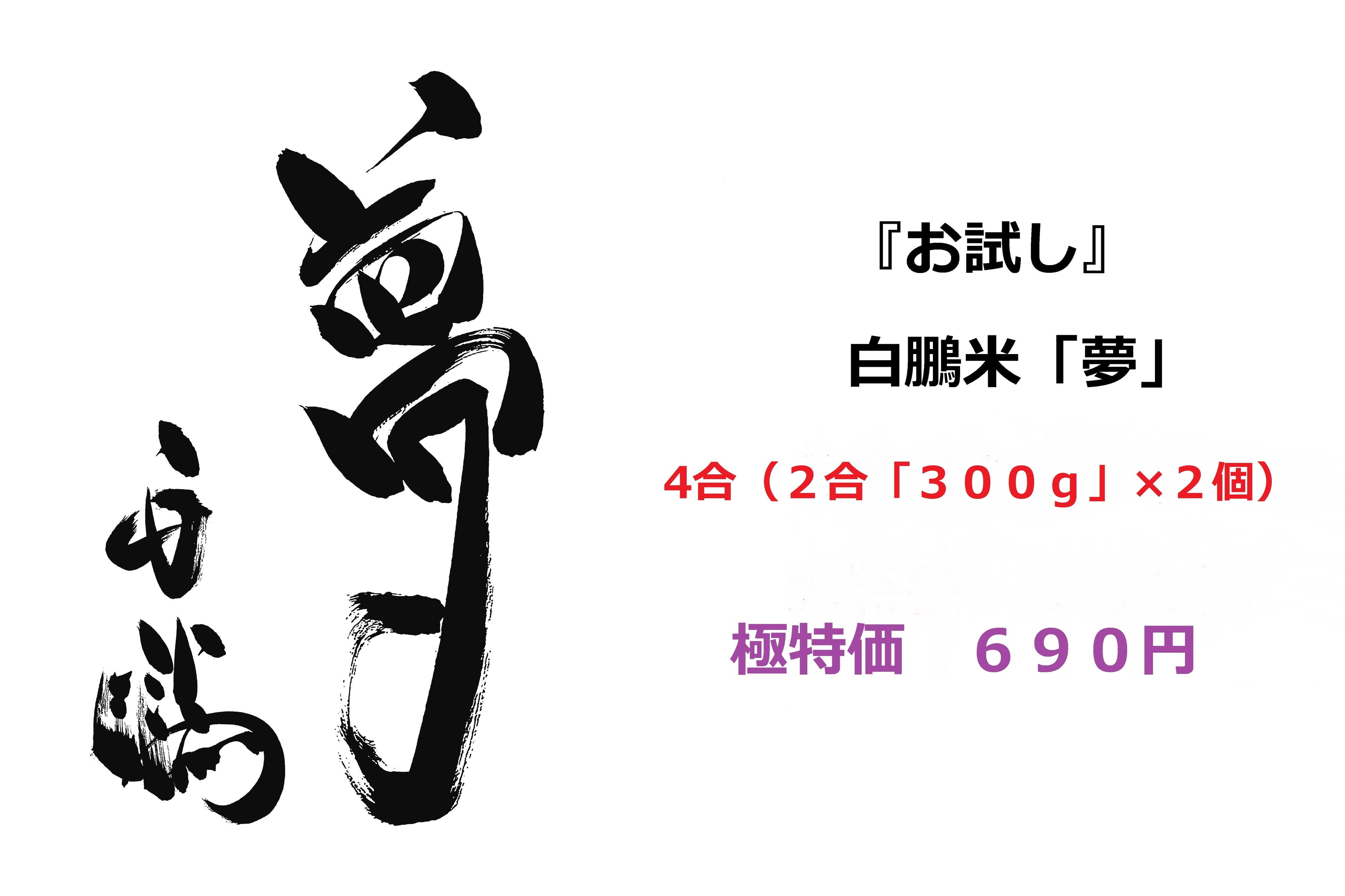 令和4年度の白鵬米夢・新米を10月より発売・発送を開始するにあたり、お試し4合(300g×2個)を10月1日より発売いたします。配送方法はクリックポストを使用することでコストを抑えることが出来きたため、690円(税込)でご提供いたします。50個限定販売ですので数に限りがございます。是非ご賞味ください。
