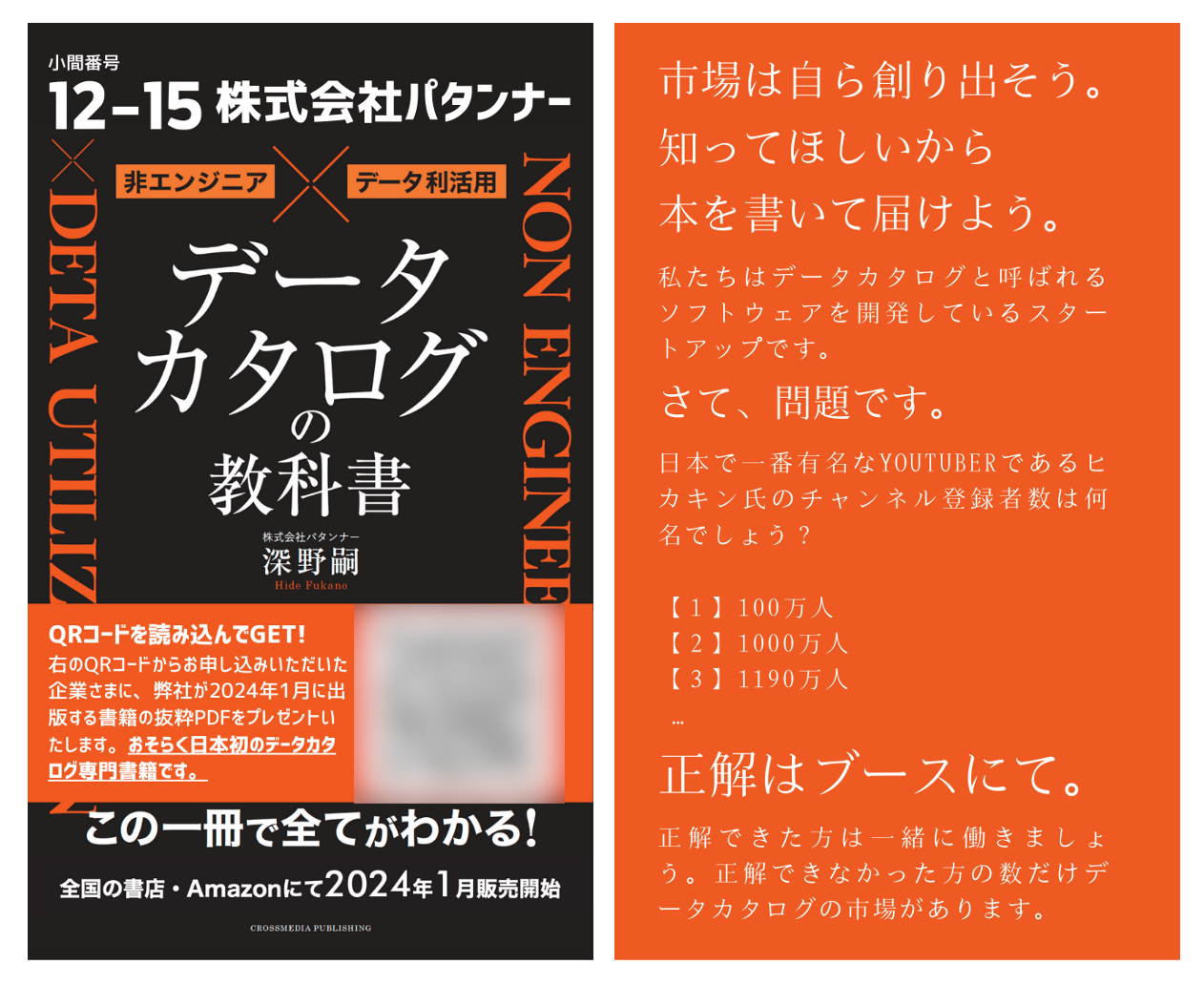 展示ブースでは、当社が2024年1月にサービス提供開始予定のデータカタログ「タヅナ」のDEMOを直接ご覧いただけます。当日限定の来場特典として、データカタログについていち早くキャッチアップできる15ページのデータカタログ活用資料を進呈します。