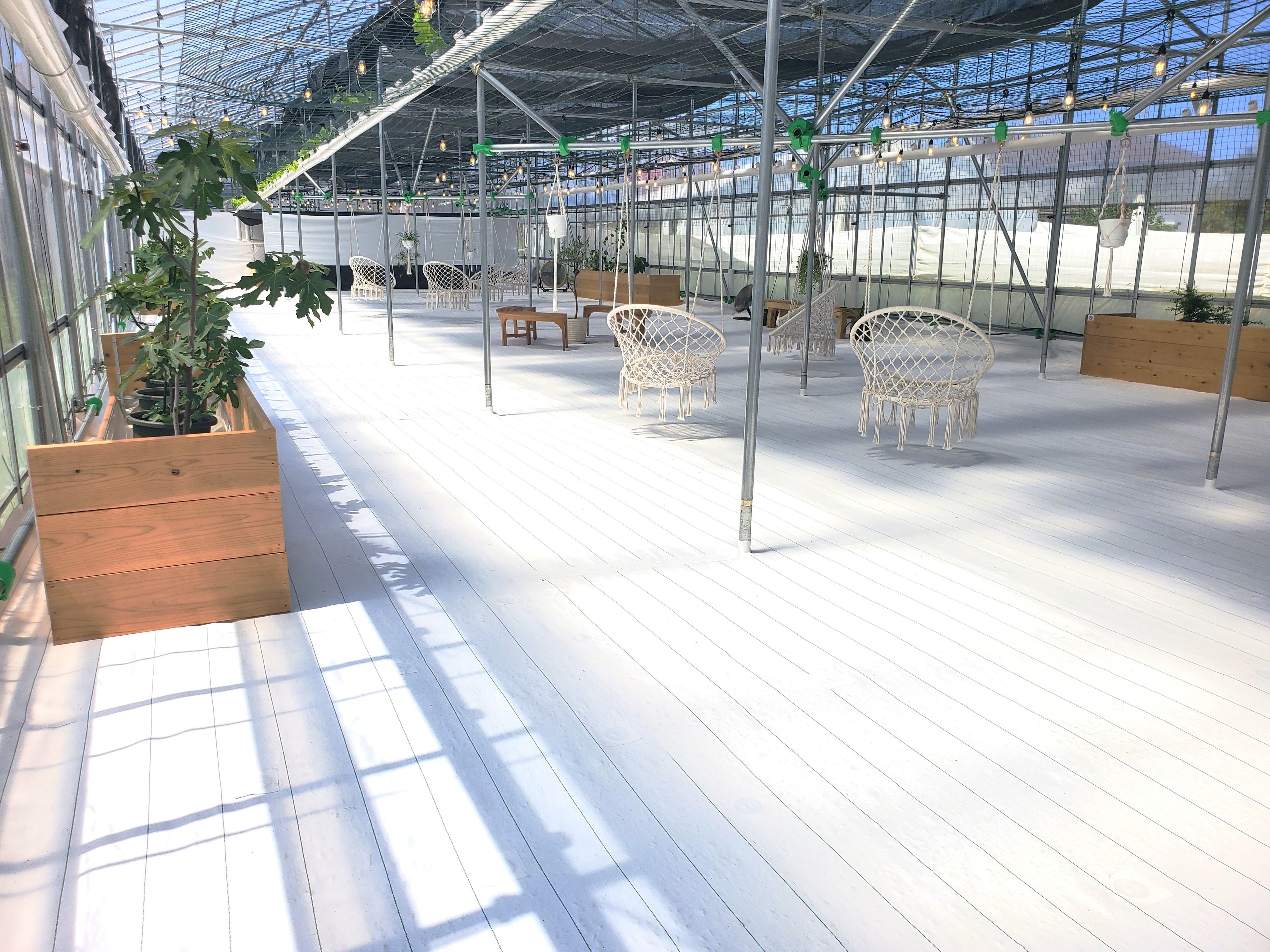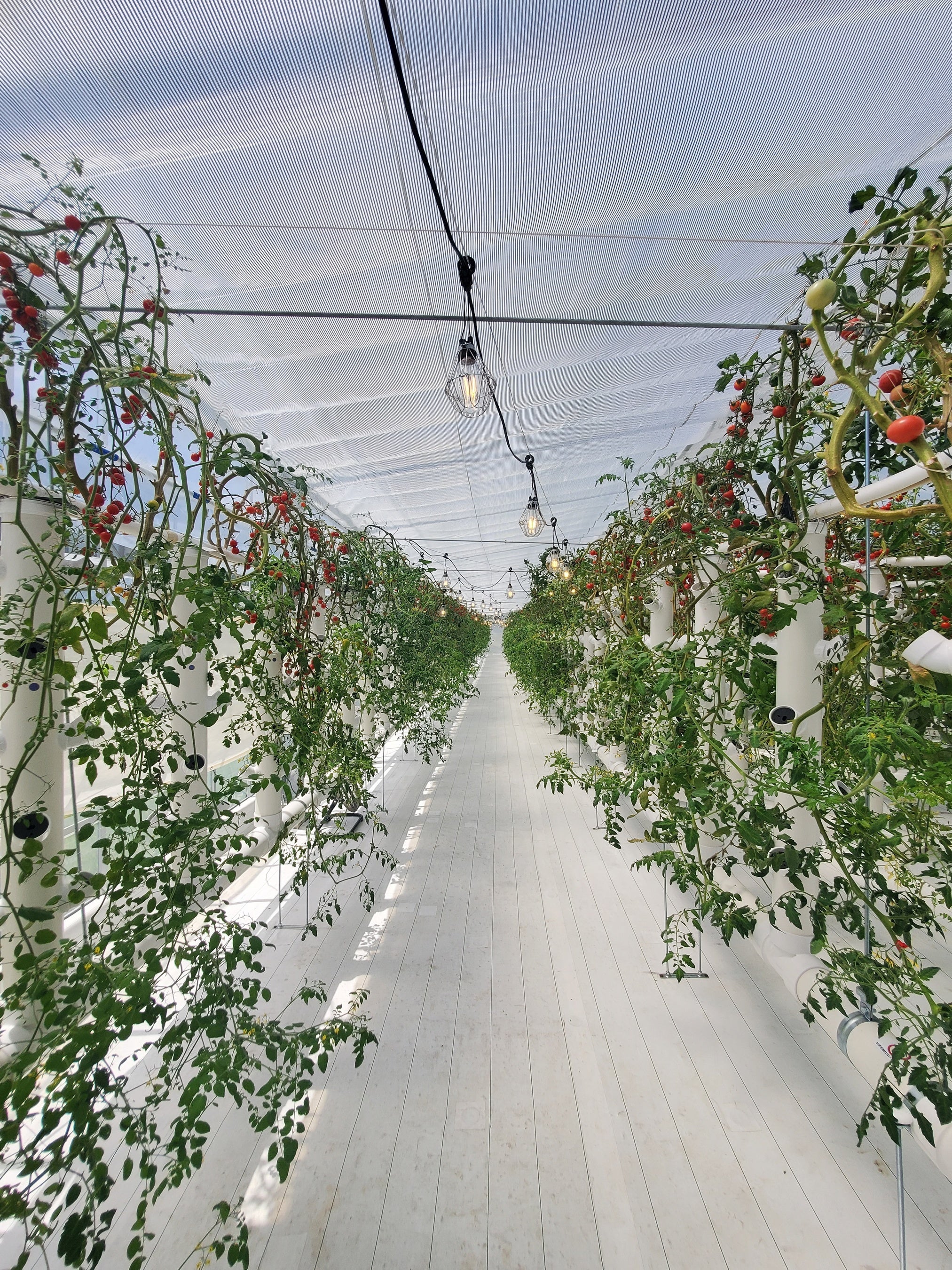 - トマトを500本以上の白いパイプで育てる「Lainbow Lab」(トマト摘み取りエリア)