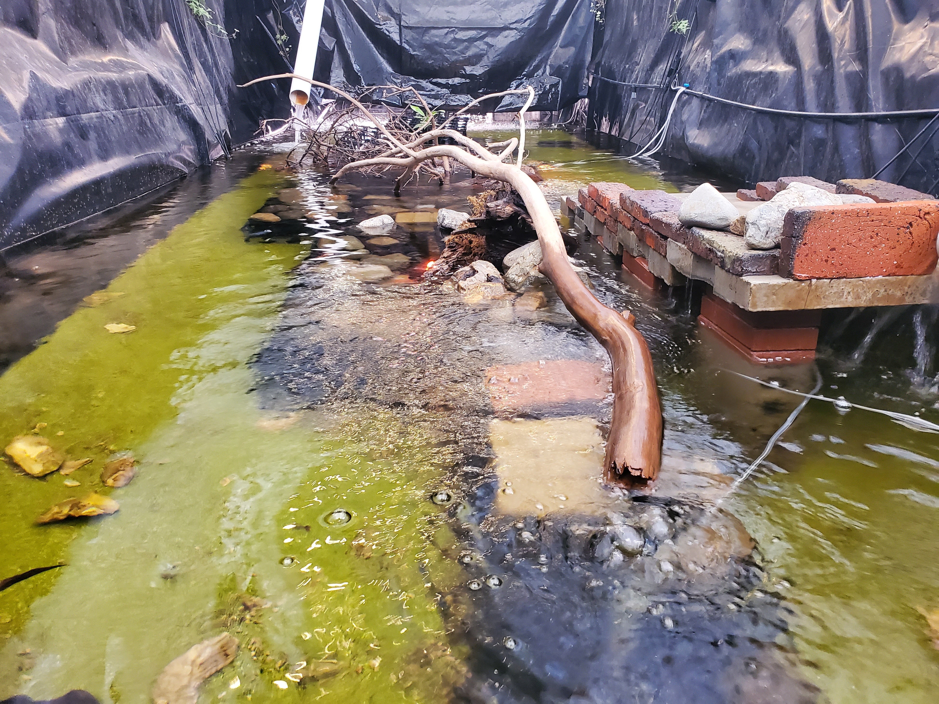 こちらでは、オニテナガエビが育ちやすい環境づくりをし、ビオトープも採用した大型養殖池をご覧いただけます。こちらで育成した水をトマトへ供給しています。また、トマトからの水も浄化されてこちらに還ってきます。
