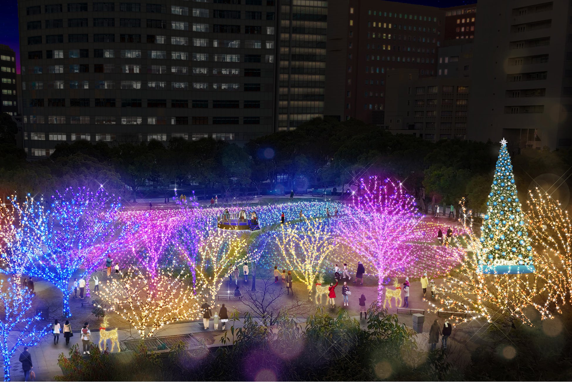 博多と天神を繋ぐ天神中央公園を⼀⼤イルミネーションスポットにすることで、 歩いて楽しい冬の福岡を実現し、クリスマスマーケットの10周年を彩ります。