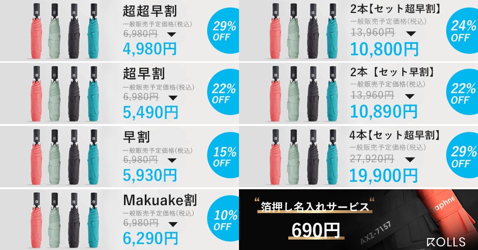 株式会社楽京(本社:東京都板橋区 代表取締役:JHAO YURUEI)は、10⽉17⽇(月)20時より応援購⼊サービス「Makuake」にて、極はっ水&形状記憶「ROLLS AUTO折り畳み傘」の先⾏販売を開始しました。公開開始から約15分で⽬標⾦額に達成しております。
