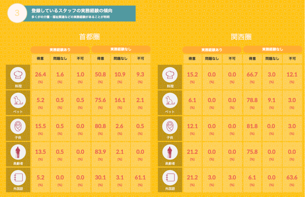 - 登録スタッフの多くがペット・子供・高齢者に関するプライベートでの経験があることが判明