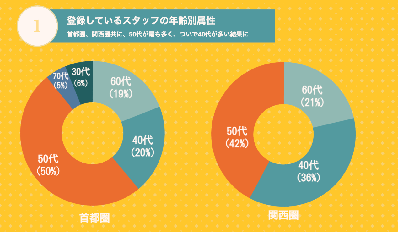スタッフ登録をしているのは、首都圏、関西圏共に、50代が最も多く、次いで40代が多い結果に