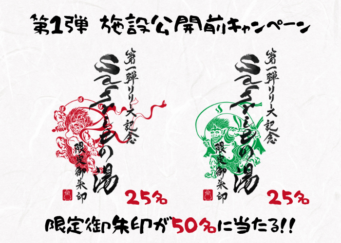 アカウントをフォローしてキャンペーンツイートをリツイートすると、弊社の「Safrieの湯(実際には存在しません)」の限定御朱印を50名様限定でプレゼントします。風神と雷神の絵柄が25名様ずつ当たります(どちらが当たるか分かりません)。