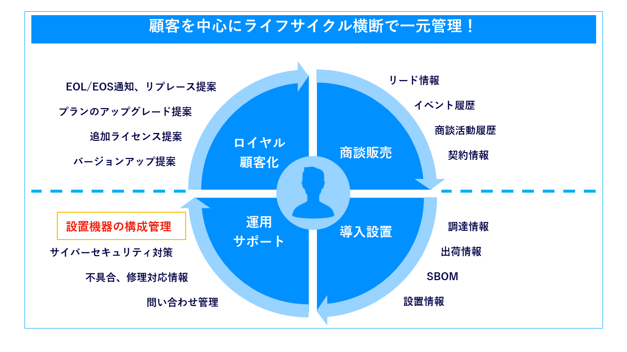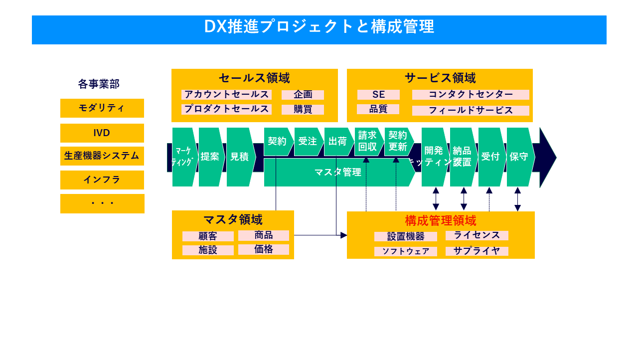 DXが進展する現在、医療機器メーカーや販社サービス企業にとって安全品質の高い医療機器及び関連サービスを提供してくためには、顧客ニーズや社会要請に応じた柔軟性な対応が求められています。製販分離が進んでいる組織において、セールス及びカスタマーサポートを支援するために各種管理システムが利用されていますが、今後、カスタマーエクスペリエンス(CX)を念頭に置いた顧客データ活用のためには、分散しているシステム間のデータ統合が必要不可欠です。特に、医療機関に納入・設置している医療機器及び関連サービスの構成情報は重要な顧客データの1つとなるでしょう。