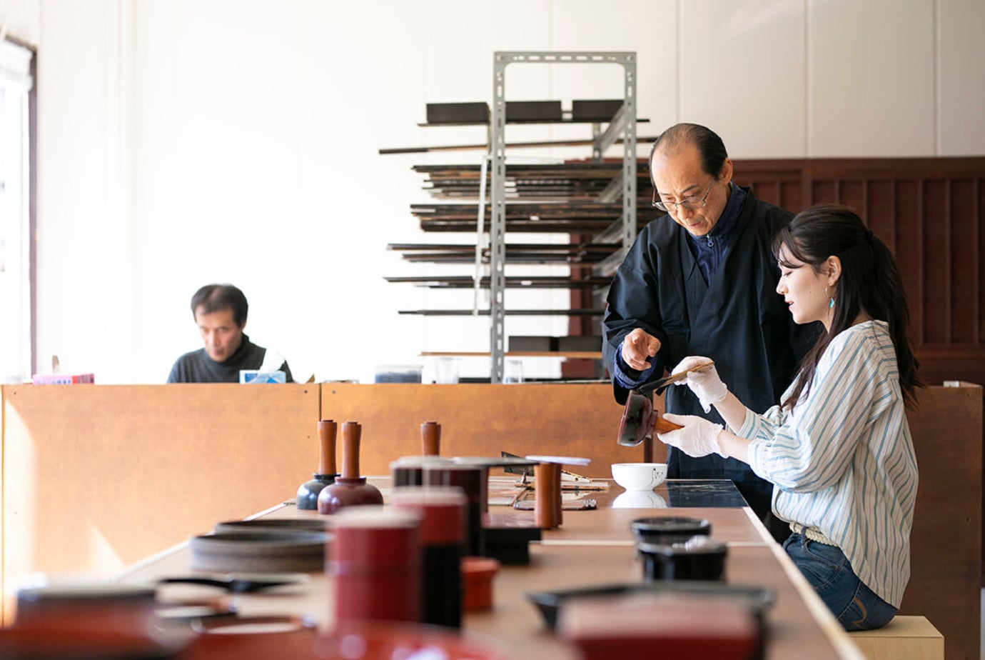 創業102年、鯖江市河和田の「曽明漆器店」の倉庫に眠っていた、漆を塗る前の木地のデッドストック品を棚柱に使用。産地の旅の期待感を高めます。