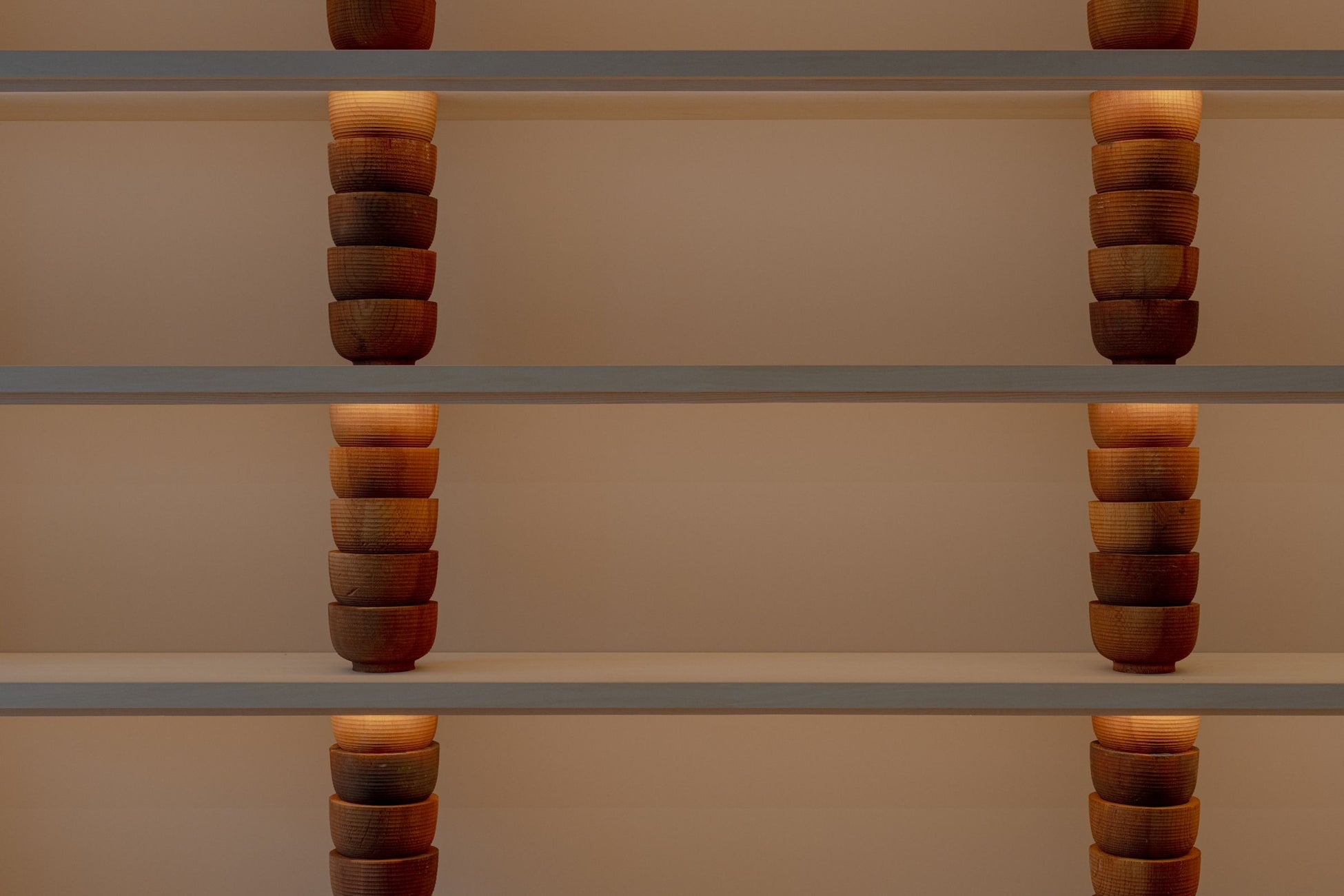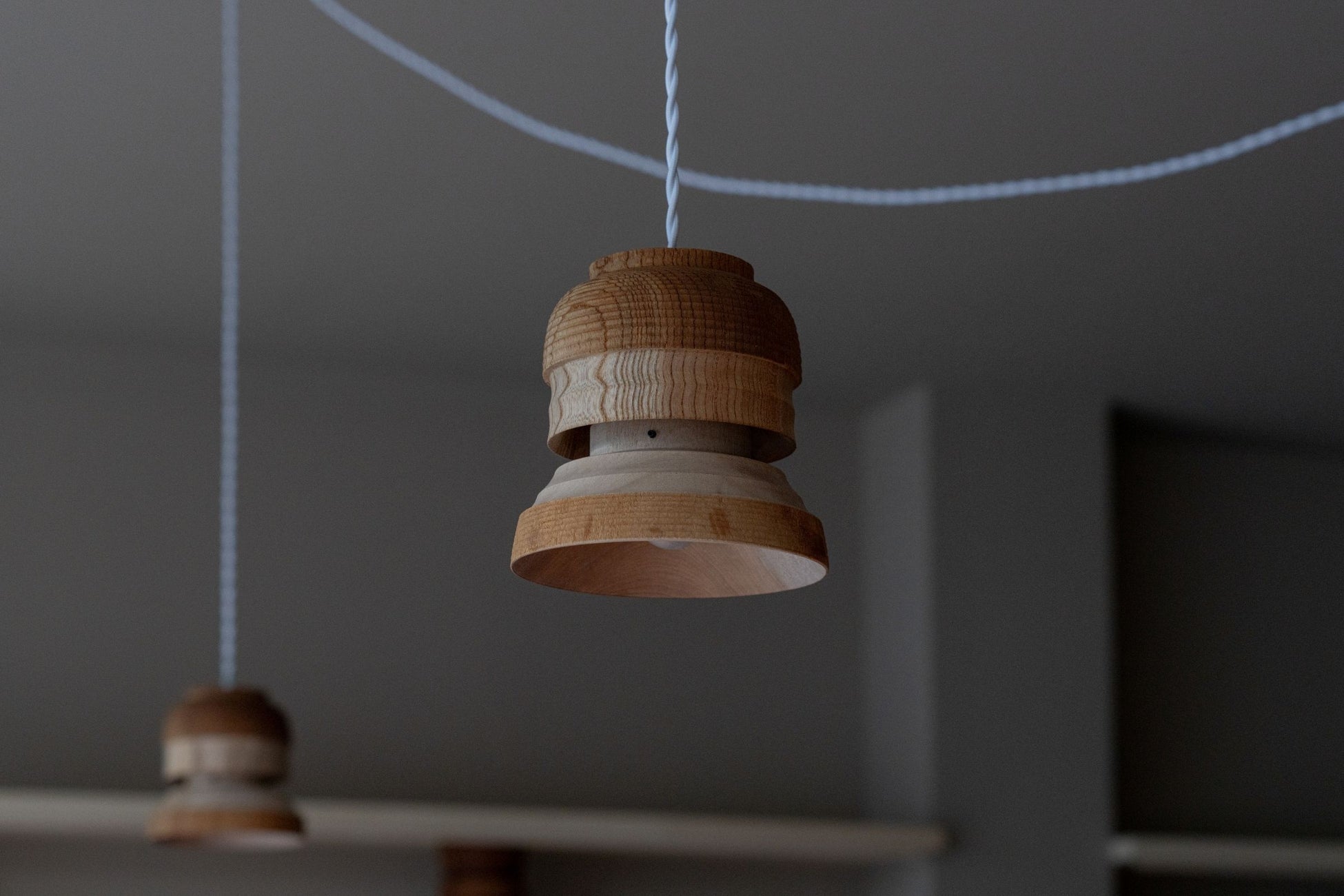 鯖江市河和田の丸物木地師「ろくろ舎」が、「曽明漆器店」の木地に加工を施し、ランプシェードを製作。光の透け具合まで計算して削り出された、職人技が際立つペンダントライトが、訪れた人をやさしく迎えます。